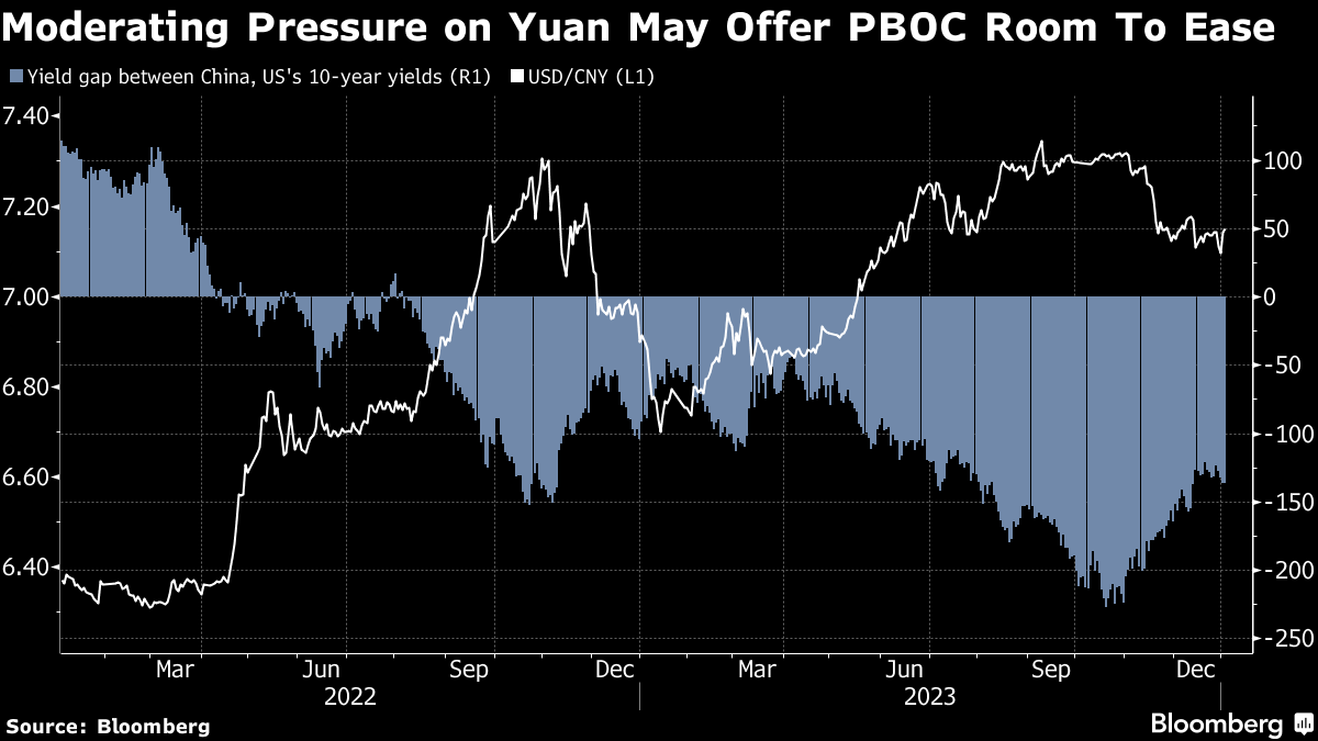 The yuan will strengthen for the first time in three years and appreciate to 7 per dollar by the end of 2024, as narrowing rate differentials ease capital outflows, a Bloomberg survey of traders and analysts shows. The PBOC's decision Wednesday to weaken the yuan's reference exchange rate by the most in over six months also signaled a pivot toward aiding growth from currency support.