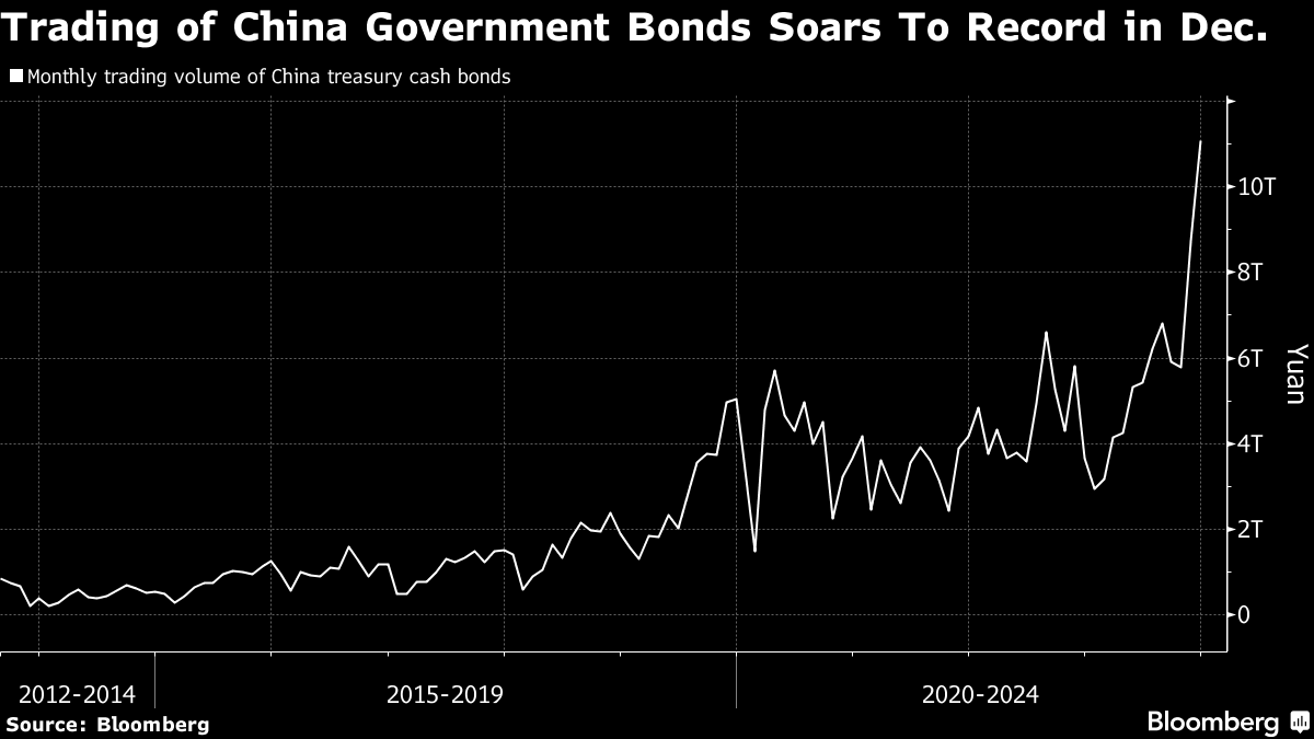 Accompanying the bond rally was a surge in trading volume, a bellwether of investor sentiment, to a record 11 trillion yuan ($1.5 trillion) in December, according to data from the China Foreign Exchange Trade System.