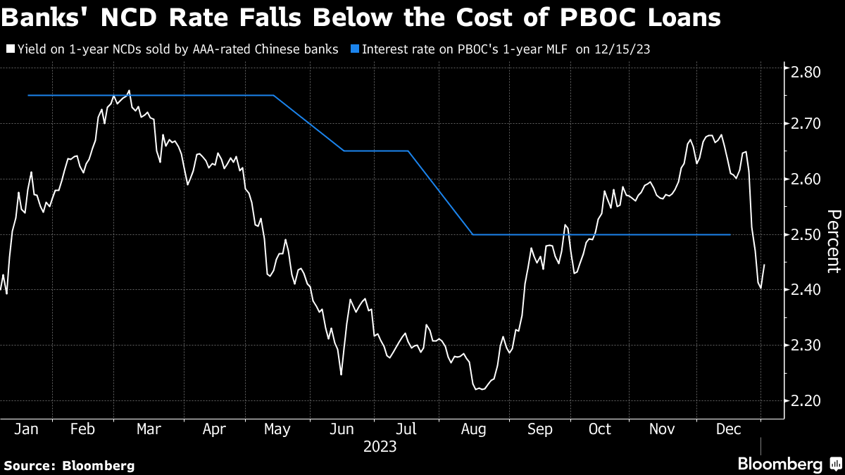The rate on one-year negotiable certificates of deposit issued by AAA rated banks is now around 2.47%, below the 2.5% on the PBOC's one-year policy loans, the first such reversal since October.