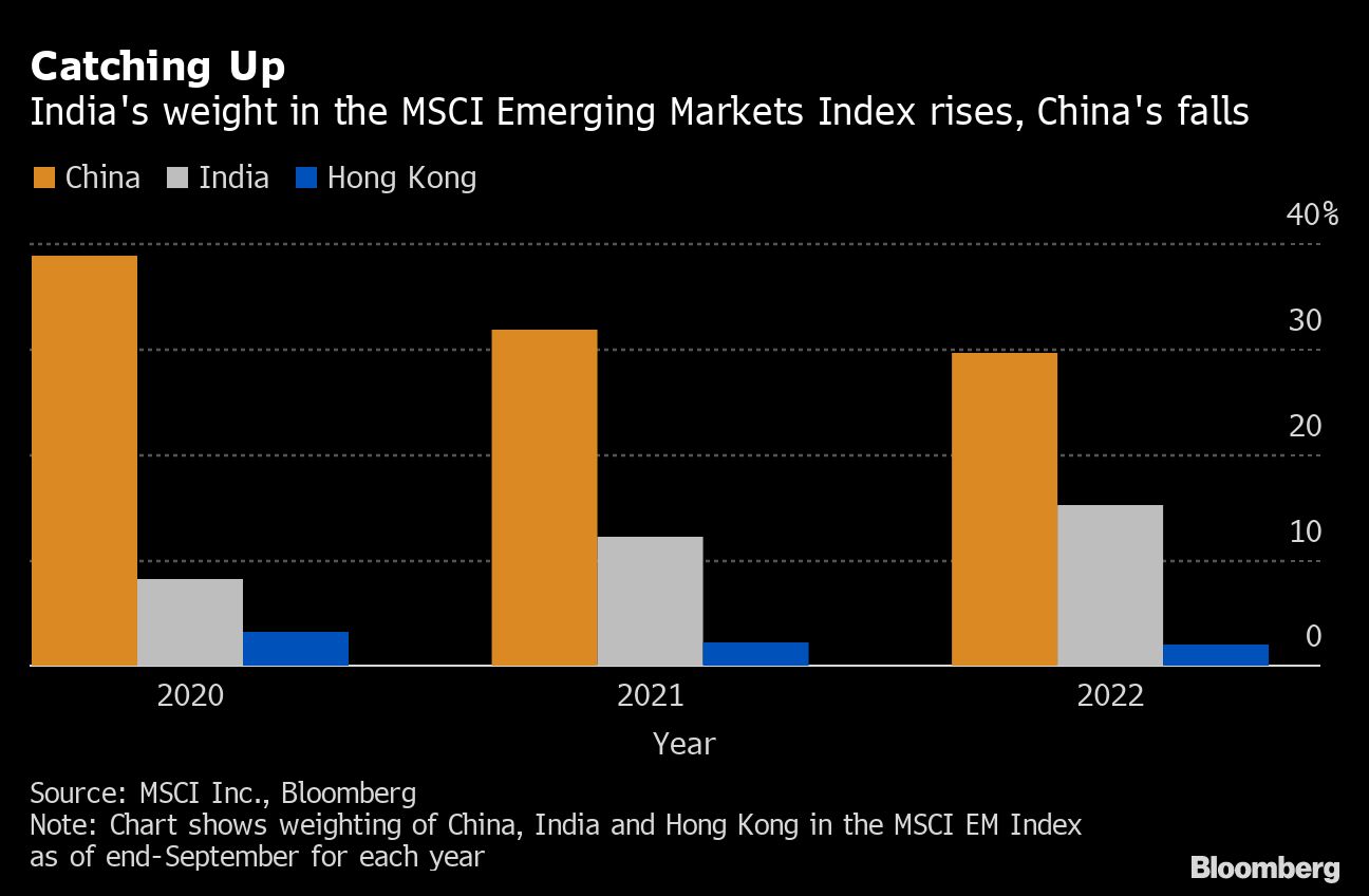 With its rising market clout, India's weight in the MSCI Emerging Markets Index has increased by almost 7 percentage points in the two years through September. Meanwhile, that of Chinese and Hong Kong stocks combined has fallen by more than 10 points.