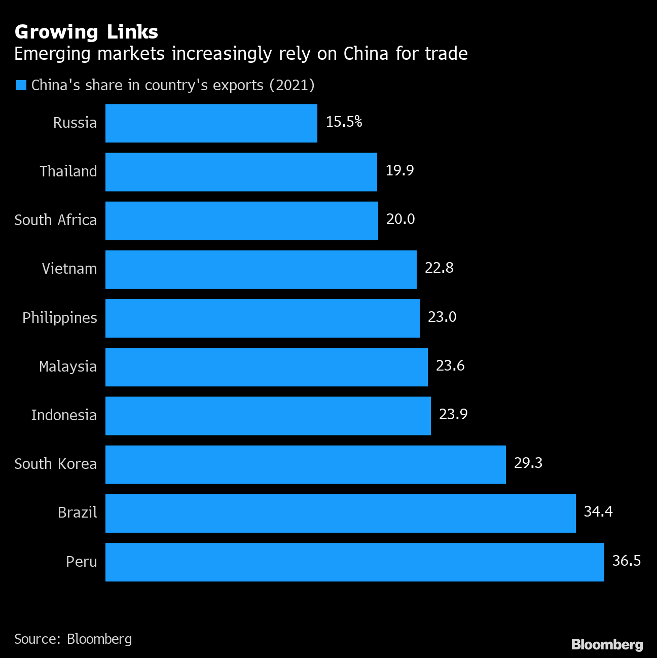 “Trade and financial linkages have significantly strengthened between China and other emerging markets, prominently over the past decade,” said Phoenix Kalen, the head of research at Societe Generale. “These deeply embedded relationships render the situation much more difficult for global emerging-market currencies to decouple from China.”