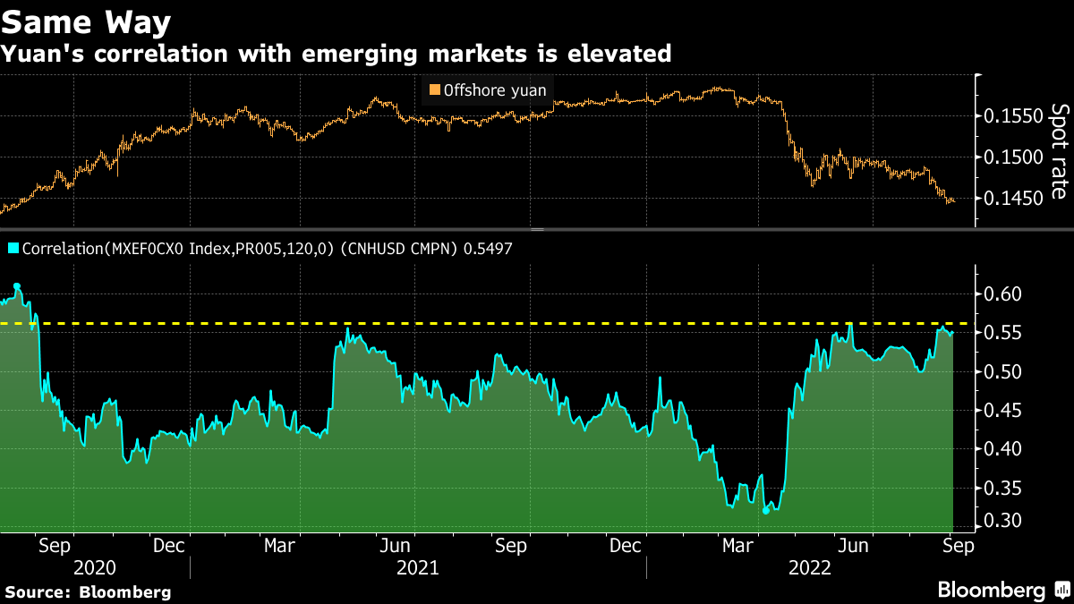 A weaker yuan has wider repercussions for emerging markets, which have endured two years of elevated inflation, jitters over the Federal Reserve's monetary tightening and the prospect of recession in key western markets. The Chinese currency, with its 30% weight in the MSCI Emerging Markets Currency Index, is pushing the gauge to the worst year since 2015. In fact, the offshore yuan's 120-day rolling correlation with the emerging world hovers near the highest level in two years, underscoring its impact.