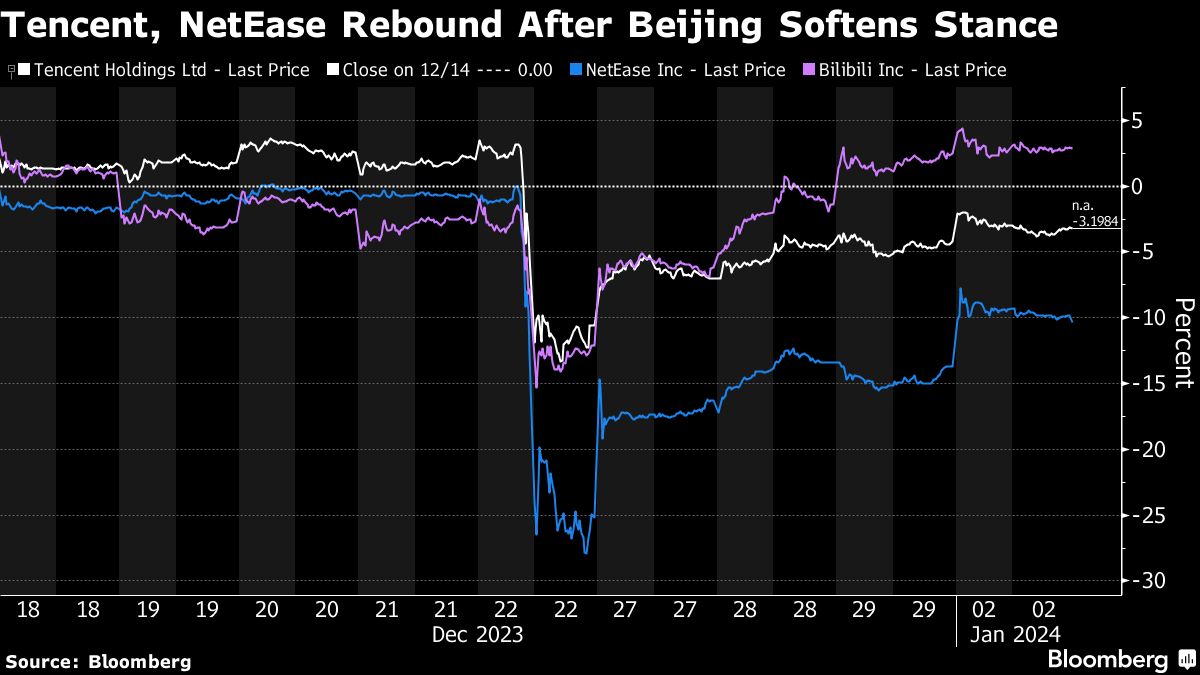 Tencent and smaller rival NetEase Inc. have recouped some of their losses but remain down from just before the holidays. They slid in early trading before recovering in Hong Kong on Wednesday, hurt also by a broader tech selloff in the US.