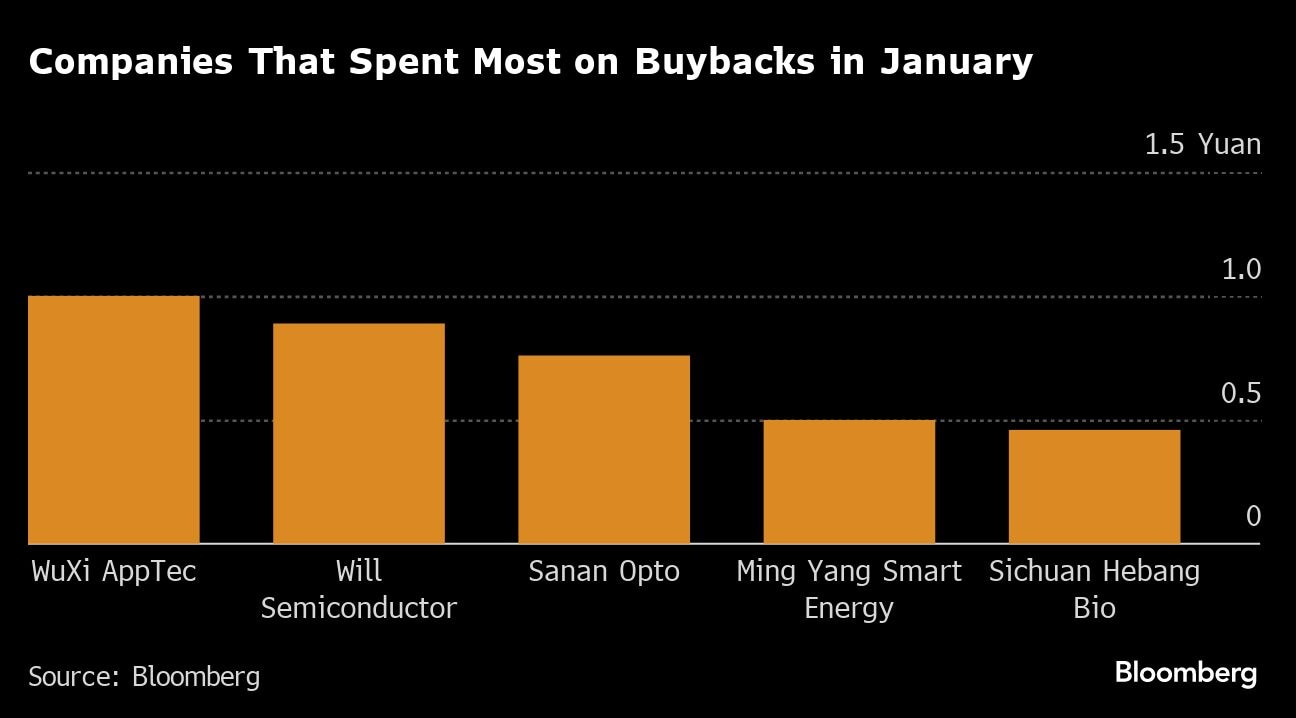 Firms listed in mainland China and Hong Kong spent 14 billion yuan ($1.9 billion) and HK$21 billion ($2.6 billion) repurchasing shares last month, respectively, each marking a record since 2021 when Bloomberg began compiling the data.