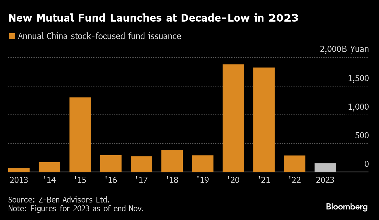 The amount of money that mutual funds raised this year has plummeted to the lowest in a decade, according to data from consultancy Z-Ben Advisors Ltd. The 152 billion yuan ($21 billion) worth of new portfolios issued up to end-November is about half of last year's total and marks a third consecutive annual drop. That's a major shift from 2020, when retail investors rushed to hand over their savings to professional stock pickers.