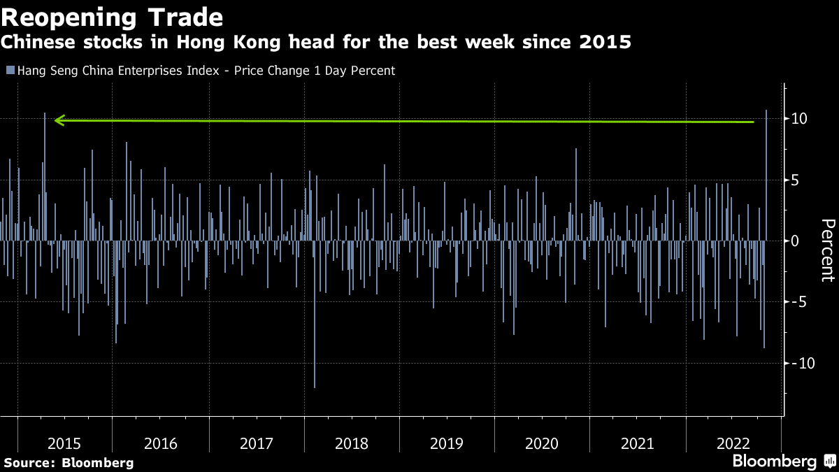 A flurry of market friendly headlines -- along with unverified talk that China is poised to exit its strict Covid Zero policy -- have put the Hang Seng China Enterprises Index on track for its best week since 2015. Led by tech names, the gauge soared as much as 8.8% on Friday, as Bloomberg News reported progress in efforts to prevent the delisting of hundreds of Chinese stocks from US bourses.