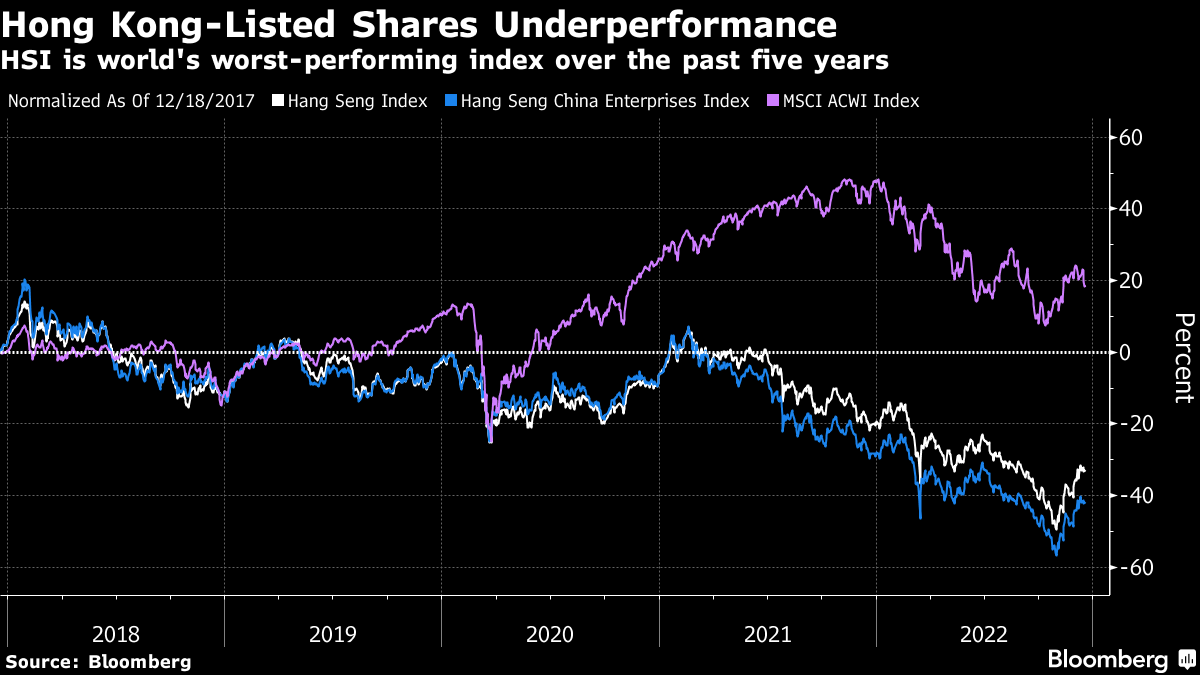 The gauge is the worst performing global benchmark in the past five years, after the Hang Seng China Enterprises Index, with a drop of 33%. MSCI Inc.'s global index has climbed 19% in that time.