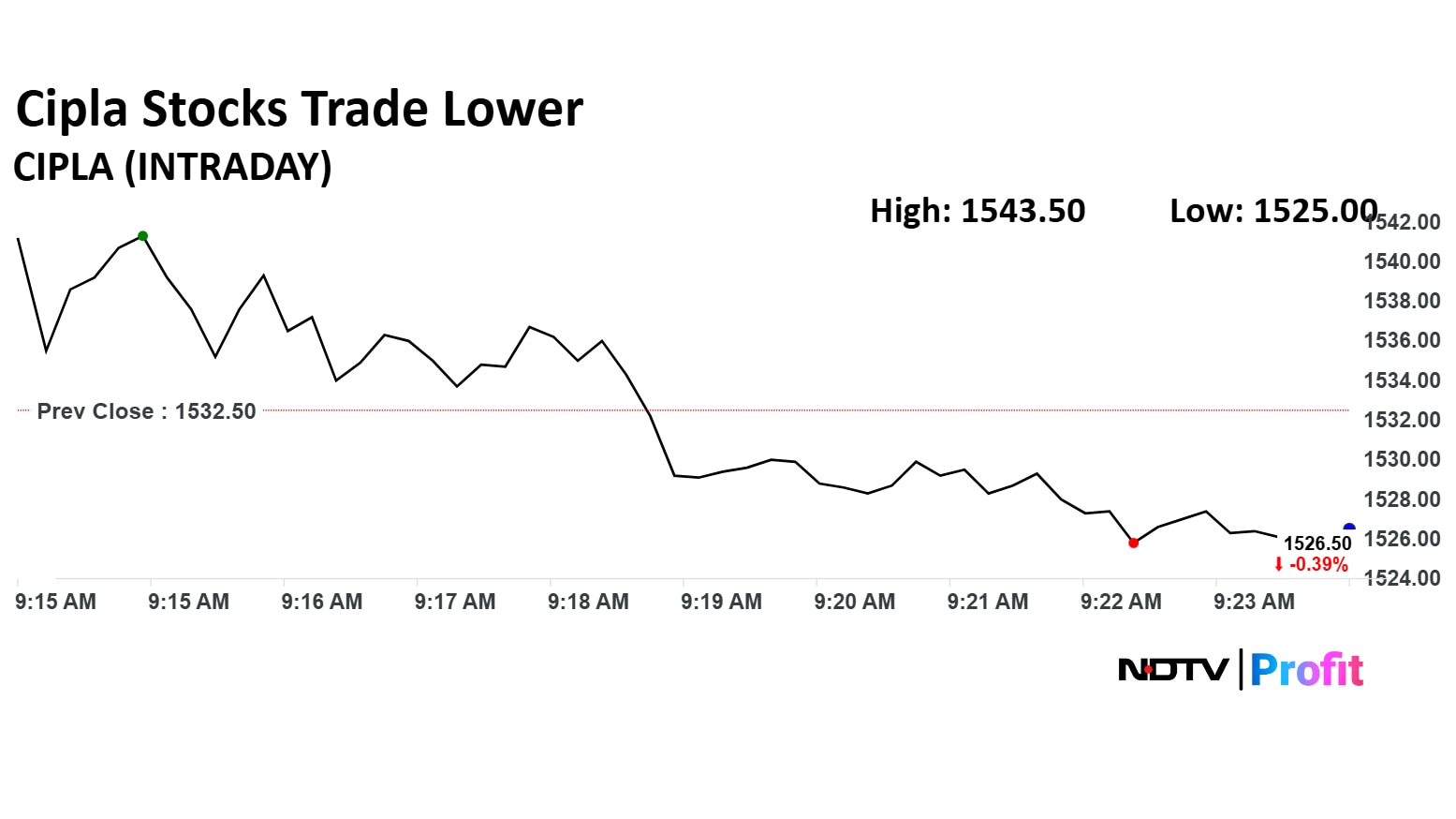 Shares of Cipla fell as much as 0.49% to Rs 1,525 apiece. They pared losses to trade 0.39% lower at Rs 1,526.50 apiece, as of 9:25 a.m. This compares to a 0.21% decline in the NSE Nifty 50.