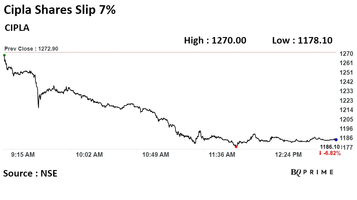 Shares of Cipla Ltd. fell as much as 7.35%, before paring loss to trade 6.76% lower at 1:05 p.m., compared to a 0.03% decline in the NSE Nifty 50.