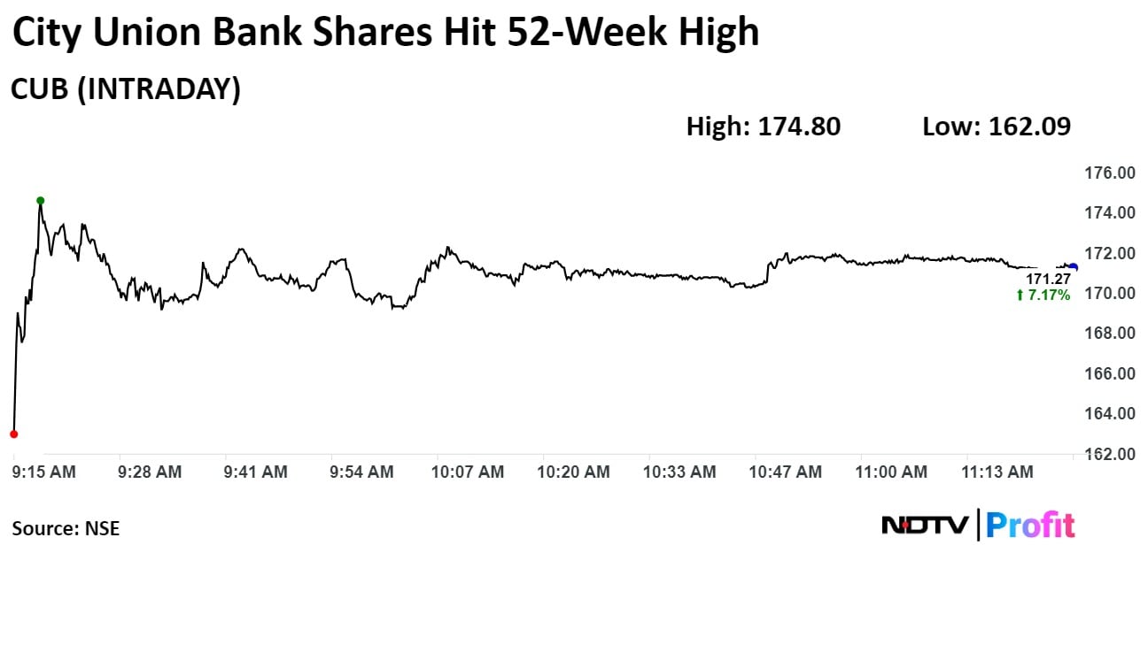 Shares of the bank rose as much as 9.38% during the day to 52-week high of Rs 174.80 apiece on the NSE. It was trading 7.21% higher at Rs 171.36 apiece, compared to a 0.47% advance in the benchmark NSE Nifty 50 as of 11:29 a.m.