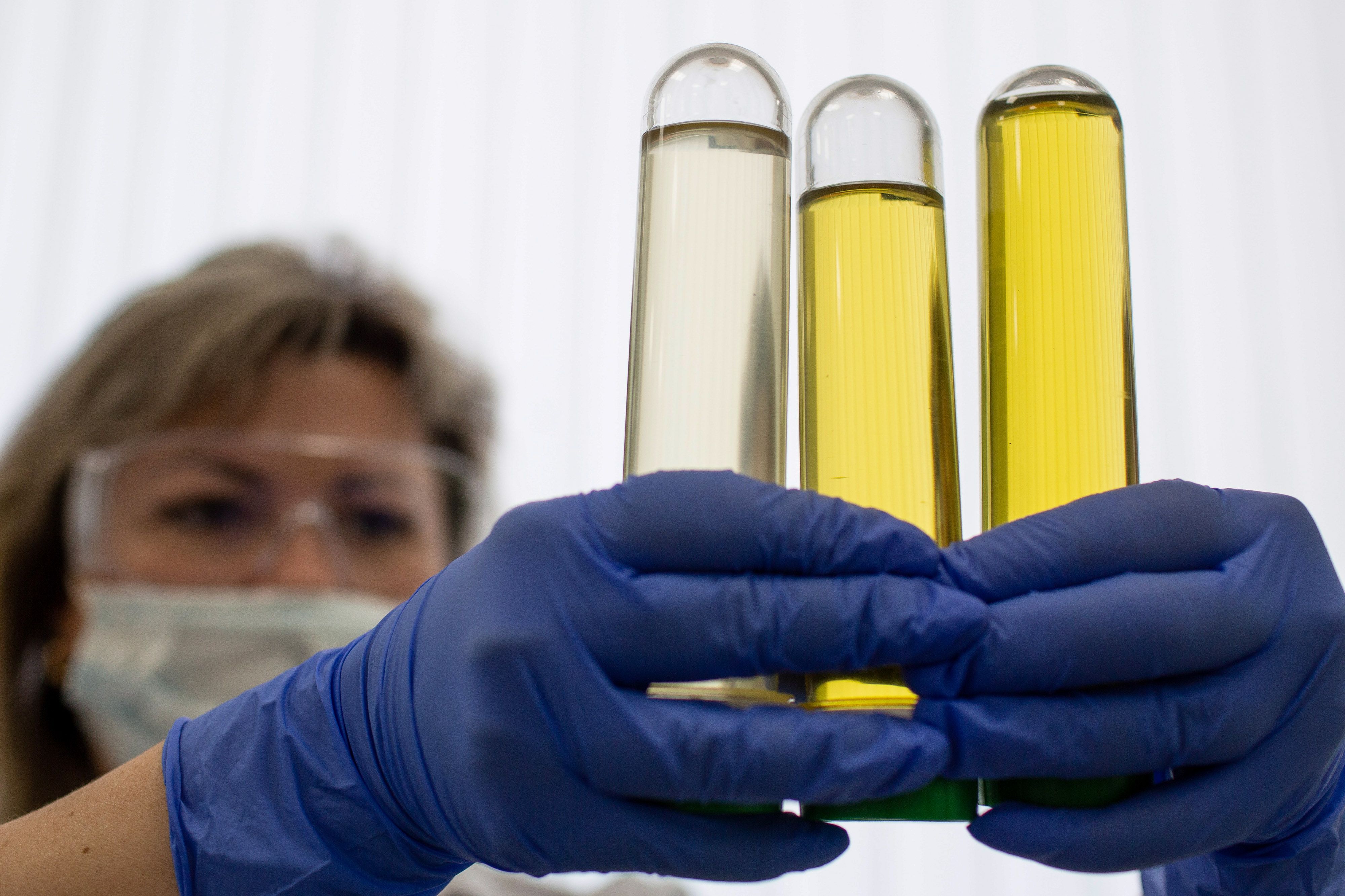A worker handles samples of sunflower oil blends in the laboratory at the EFKO JSC plant in Alekseyevka, Russia. (Photographer: Andrey Rudakov/Bloomberg)