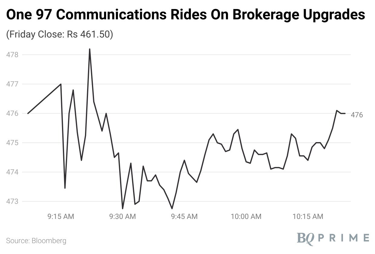 Shares of One 97 Communications Ltd. gained as much as 3.9% to Rs 479.5 apiece on Tuesday. Of the 12 analysts tracking the company, seven maintain 'buy', three suggest 'hold' and two recommend 'sell'. The return potential of the stock implies a upside of 84.3%.