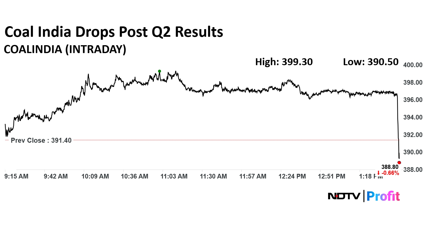 Coal India share price declined 2.49% to Rs 390.50 apiece, the lowest level since Oct 15. It was trading 2.01% down at Rs 383.25 apiece as of 2:07 p.m., as compared to 0.40% advance in the NSE Nifty 50 index.