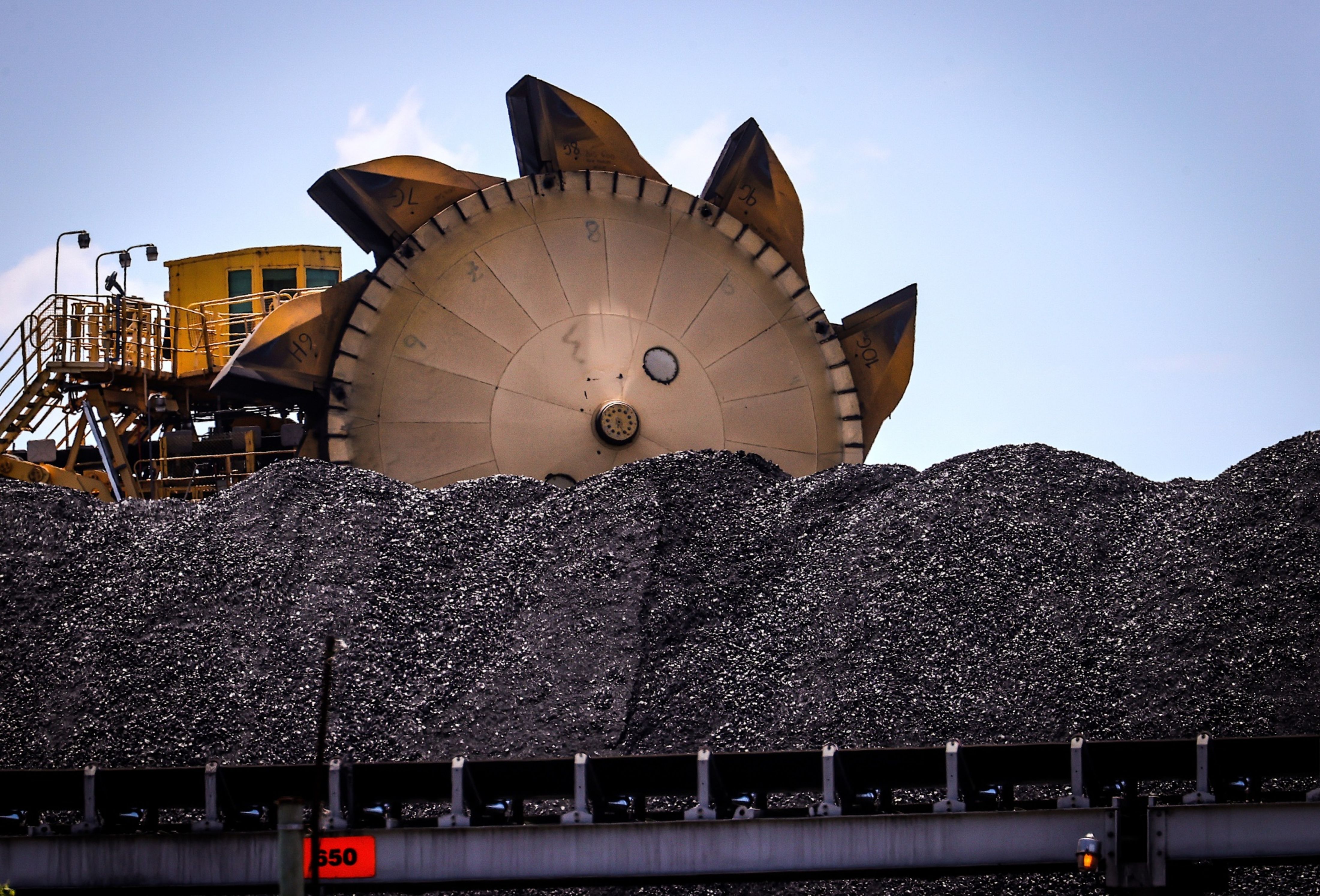 A bucket-wheel reclaimer stands next to a pile of coal at a port. (Photographer: David Gray/Bloomberg)