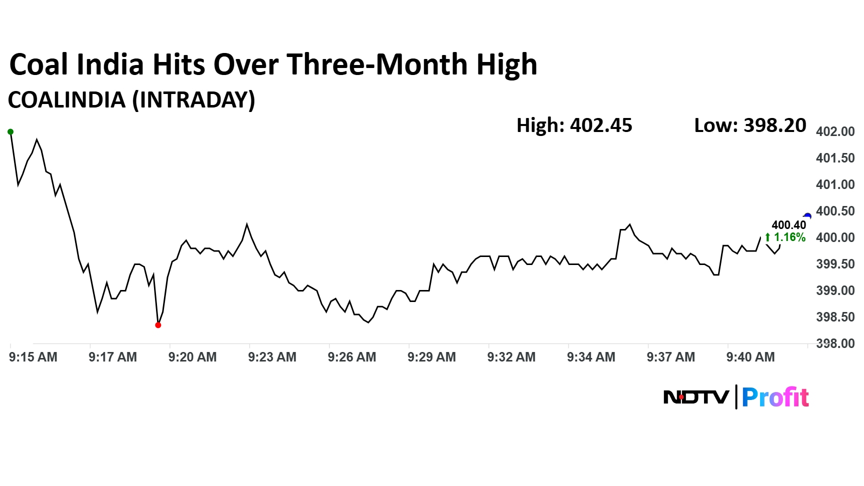 Coal India share price advanced 1.68% to Rs 402.45 apiece, the highest level since June 11. It was trading 0.76% higher at Rs 398 apiece as of 10:16 a.m. compared to 0.27% advance in the NSE Nifty 50 index.