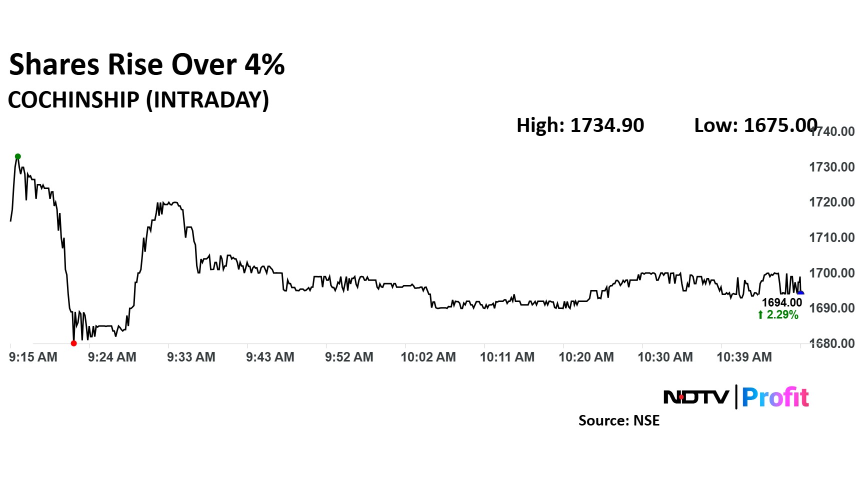 Share price of Cochin Shipyard rose as much as 4.76% before paring gains to trade 2.35% higher at Rs 1,695 apiece, as of 10:40 a.m. This compares to a 0.57% advance in the NSE Nifty 50.