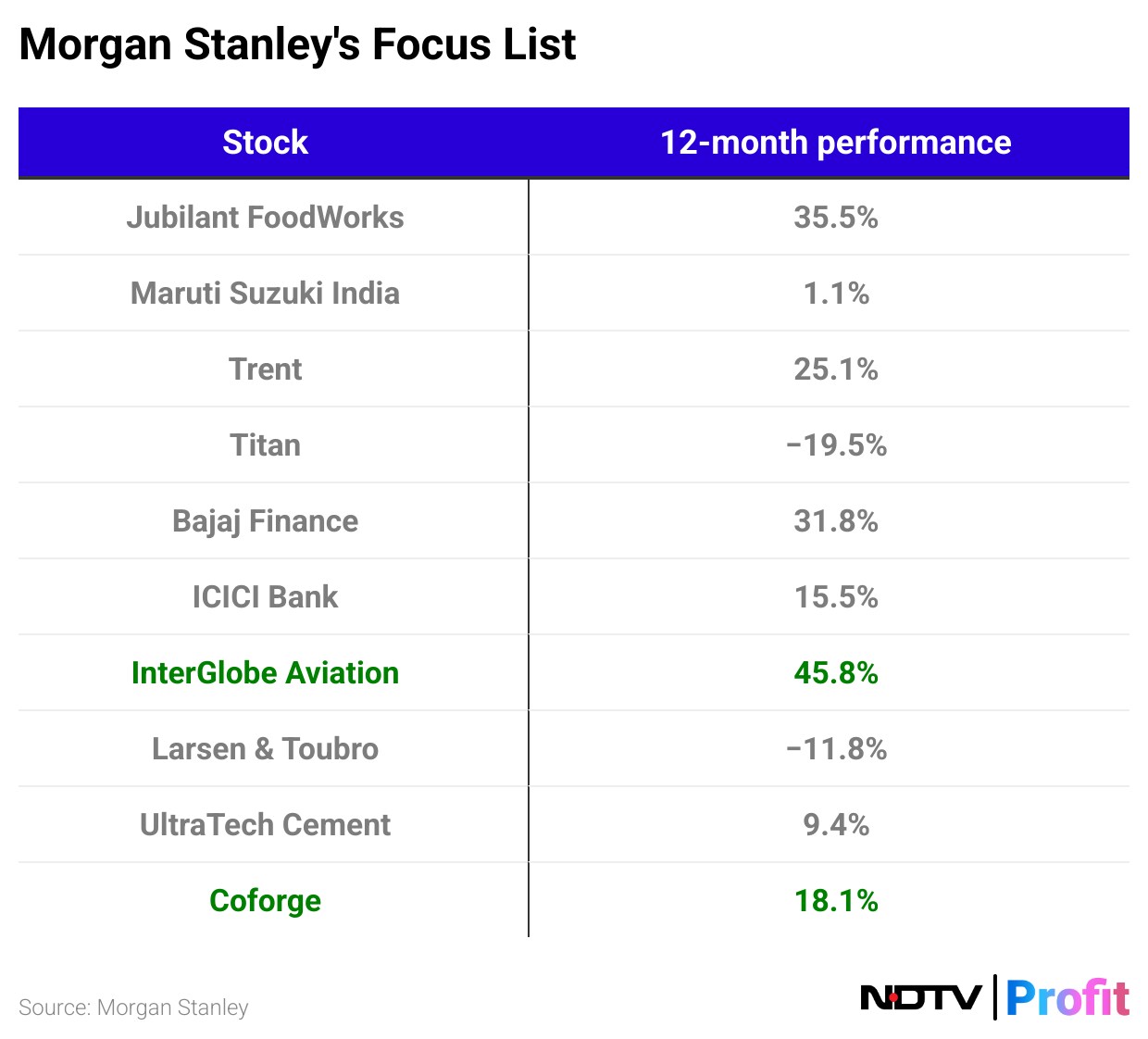 Morgan Stanley's focus list also includes Jubilant FoodWorks Ltd., Maruti Suzuki India Ltd., Trent Ltd., Titan Co., Bajaj Finance Ltd., ICICI Bank Ltd., Larsen & Toubro Ltd., and UltraTech Cement Ltd.