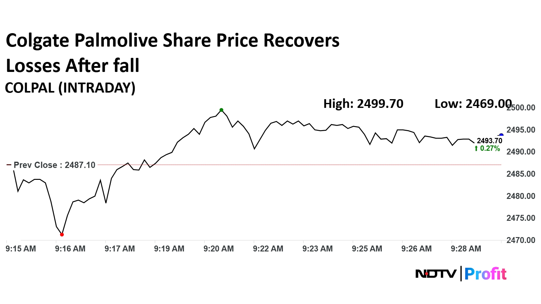 Share price for Colgate Palmolive fell as much as 0.73% to Rs 2,469 apiece, the lowest level since April 2025. It pared losses to trade 0.36% higher at Rs 2,469.30 apiece, as of 9:23 a.m. This compares to a 0.40% advance in the NSE Nifty 50.