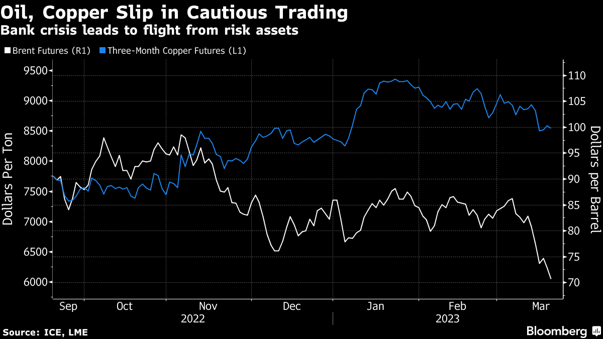 Oil sank, with US benchmark West Texas Intermediate plunging below $65 a barrel to hit the lowest level since late 2021, while copper also dropped after failing to hold an early gain. Still, gold — which benefited from the banking turmoil with a 6.5% surge last week — rose above $2,000 an ounce for the first time in a year, suggesting that demand for havens remains robust.
