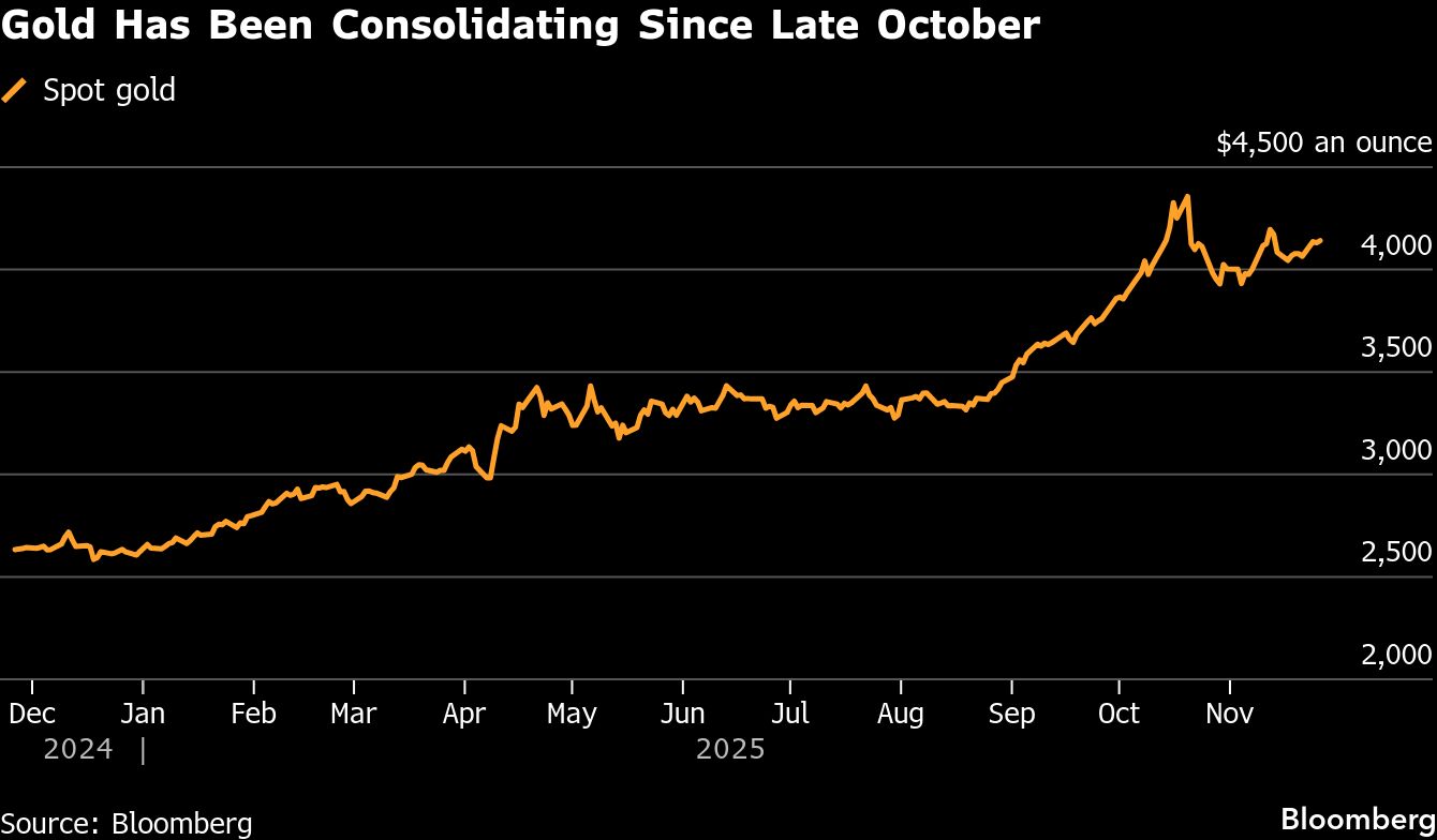 Gold has consolidated above the $4,000-an-ounce threshold after retreating from last month's peak above $4,380 an ounce. The metal — on track for its best annual performance since 1979 — has risen more than 55% this year, boosted by central-bank purchases and strong retail demand on the back of the so-called debasement trade, where investors avoid sovereign debt and currencies.