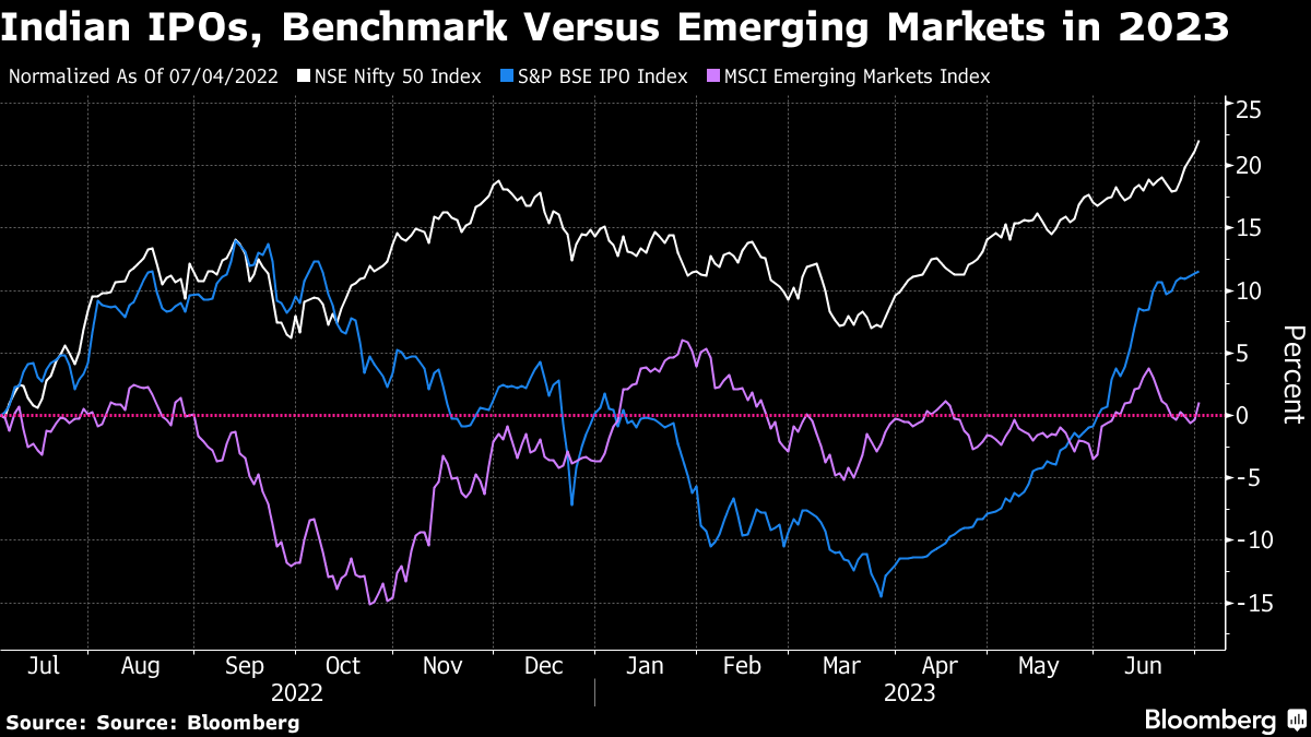 Still, India's main equities benchmark has outperformed emerging market peers this year as domestic spending helped drive economic growth. As well, a slowdown in offerings by Chinese companies has given India an edge as investors seek potential returns in alternative emerging markets.