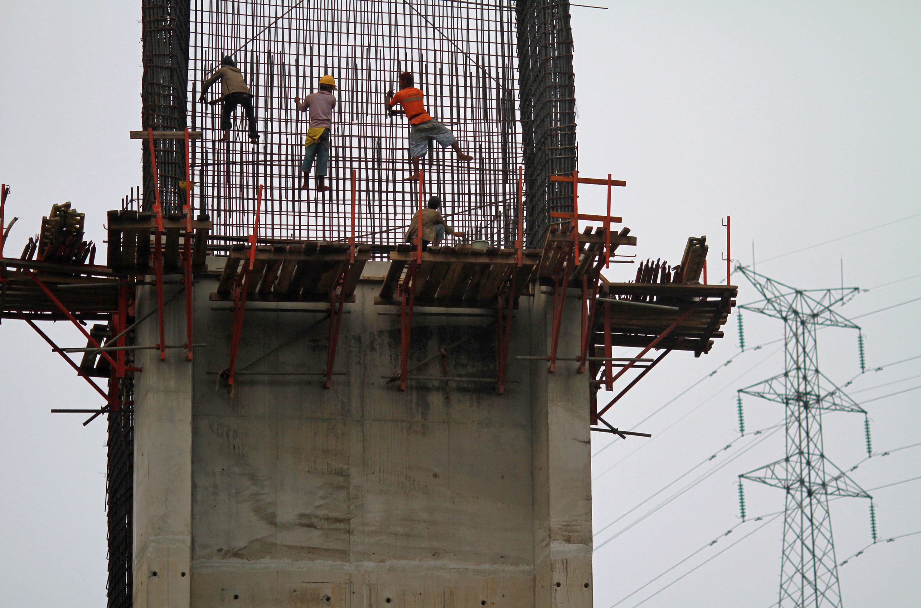 Workers labor on the construction of a highway. (Photographer: Dimas Ardian/Bloomberg)