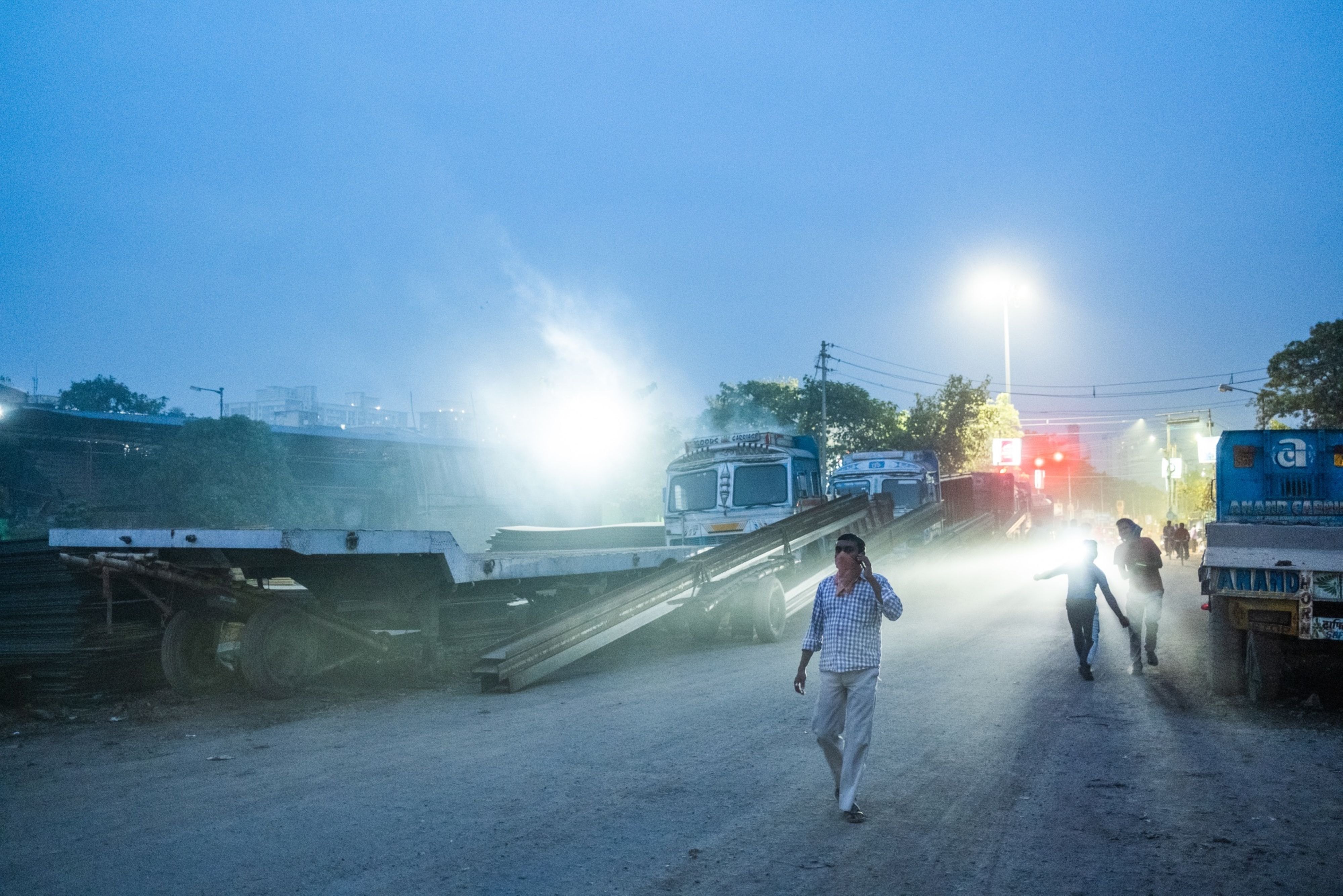 Trucks line up at a truck terminal near the Second Hoogly Bridge in the Howrah district of Kolkata. (Photographer: Arko Datto/Bloomberg)