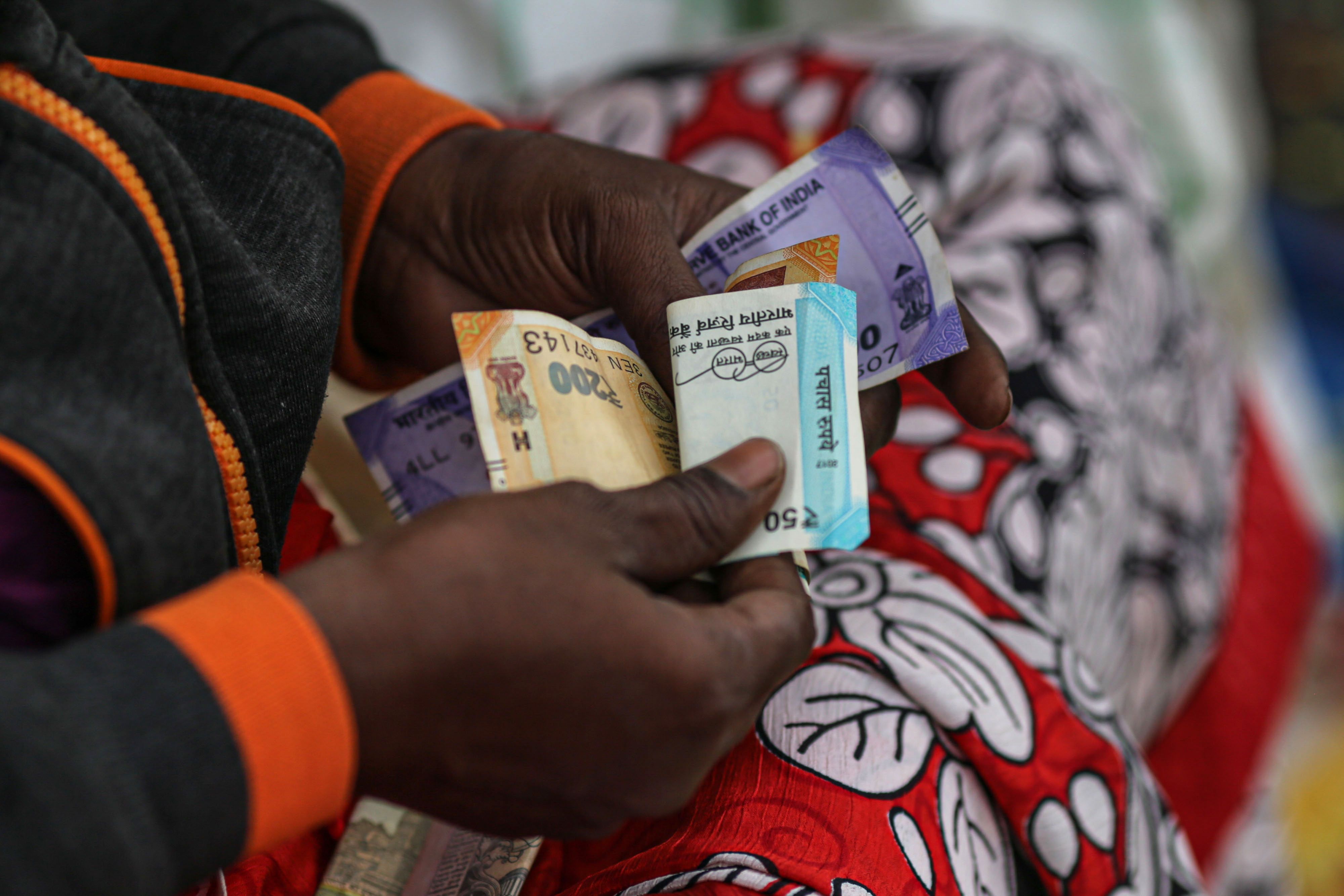 A flower vendor counts Indian rupee bank notes in Bengaluru, India. (Photographer: Dhiraj Singh/Bloomberg)