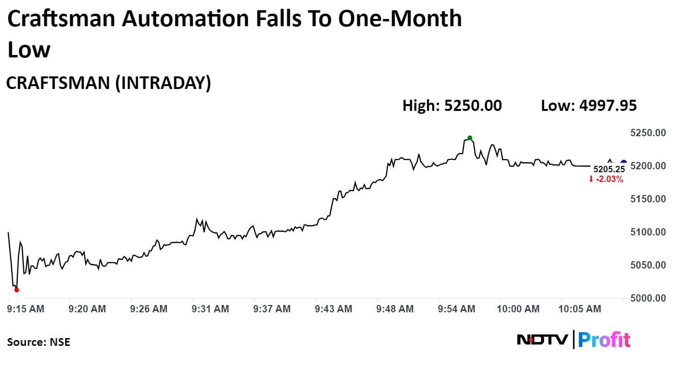 On the NSE, Craftsman's stock declined as much as 5.93% in early trade to Rs 4,997.95 apiece, the lowest since June 25. It was trading 2.13% lower at Rs 5,200 per share, compared to a 0.53% decline in the benchmark Nifty at 10:07 a.m.