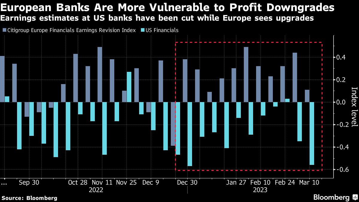The banking crisis in the US following the sudden failure of SVB and two other lenders has also led investors to swiftly temper expectations of rate hikes by the Federal Reserve, and as a result, the European Central Bank. That leaves earnings at European lenders particularly vulnerable as they've still seen estimate upgrades outnumber downgrades this year, according to a Citigroup Inc. index. Estimates at US banks, on the other hand, have been consistently reduced over that period.
