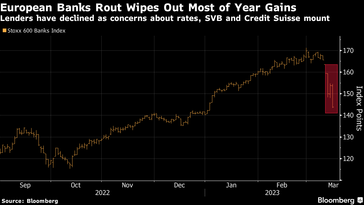 The sector — among the year's biggest gainers until last week against the backdrop of rising interest rates and a resilient economy — is now barely positive in 2023 after sinking 14% since March 9 as the collapse of US lender Silicon Valley Bank triggered concerns about the health of the global financial system. The crisis at Credit Suisse Group AG, which sank to a record low Wednesday after a top investor ruled out any additional support, compounded those worries.