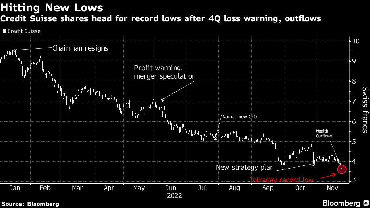 Andreas Venditti, an analyst at Vontobel, said he was “stunned” by the outflows and predicted Credit Suisse will post another loss next year amid elevated funding costs. He cut his price target for the shares to 3.5 francs from 4 francs.
