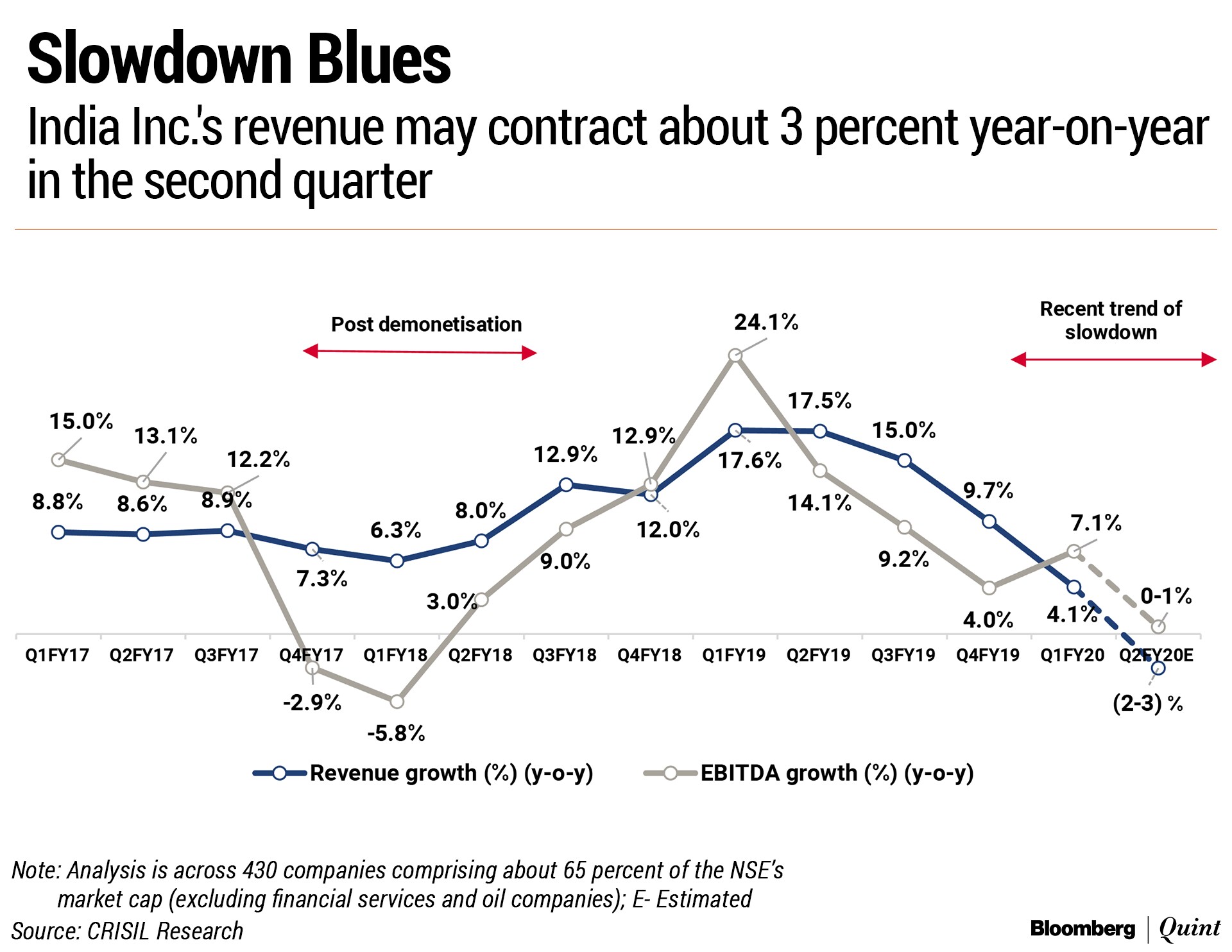 India Inc.'s revenue may contract for the first time in 14 quarters as consumption slowed in the economy, according to Crisil Research.