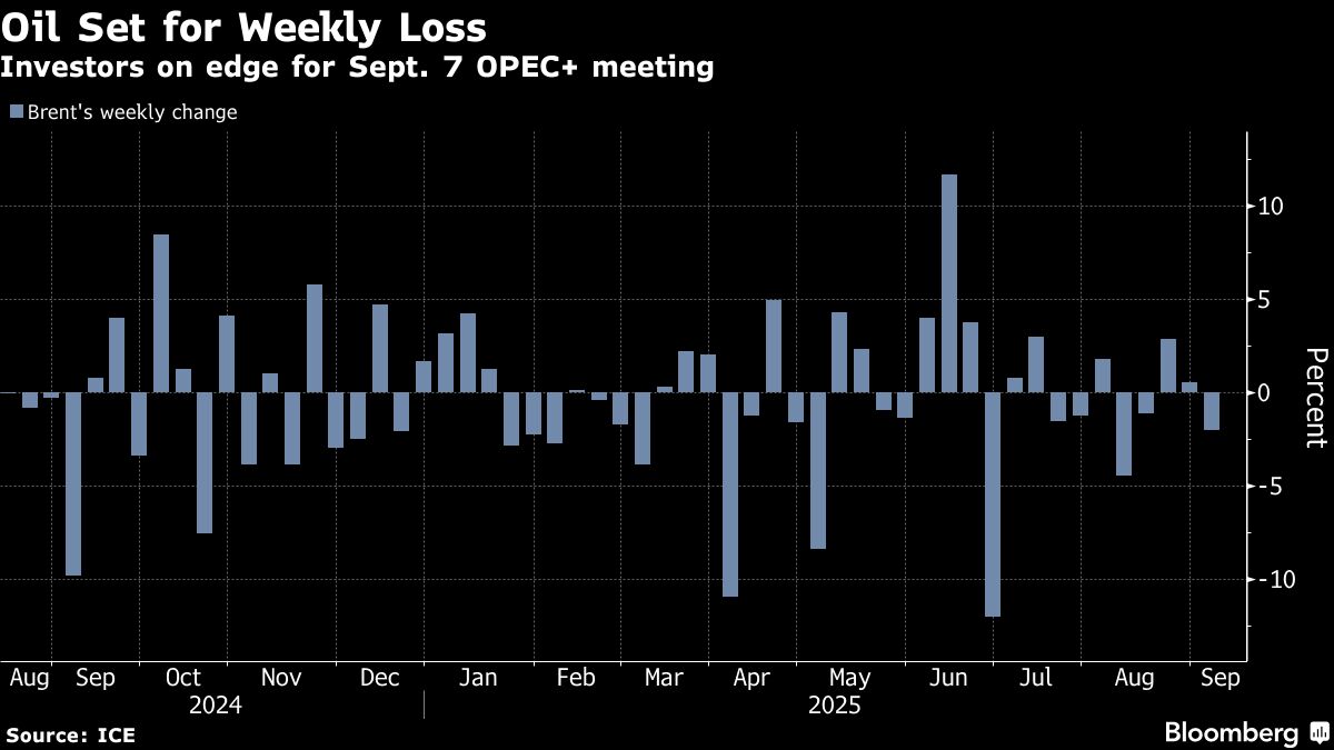 Brent fell toward $66 a barrel after losing more than 3% over the prior two sessions, while West Texas Intermediate was near $63. The alliance is due to hold a virtual meeting on Sept. 7 to decide the next move after completing the restoration of 2.5 million barrels a day of supply at its previous gathering.