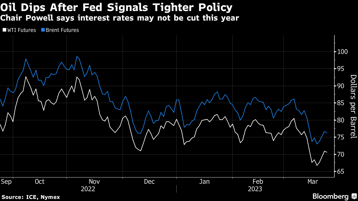West Texas Intermediate futures mostly traded between $70 and $71 a barrel on Thursday. Brent and WTI, though down from Wednesday's close, were near the same levels they were at before Fed Chair Jerome Powell advised that more tightening may be in store after this week's 25 basis-point increase, and said officials don't expect to be cutting rates this year. His comments came less than two weeks after the most severe banking crisis since 2008.