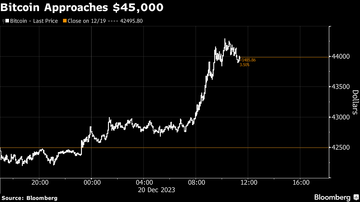 Meanwhile, Bitcoin is trading at the highest price in more than a week with the Securities and Exchange Commission facing a Jan. 10 deadline to reject or approve ETFs. Bitcoin rose as much as 4.2% to $44,294 on Wednesday. The token, which accounts for about half of crypto's $1.6 trillion market capitalization, last traded at $45,000 in April 2021.