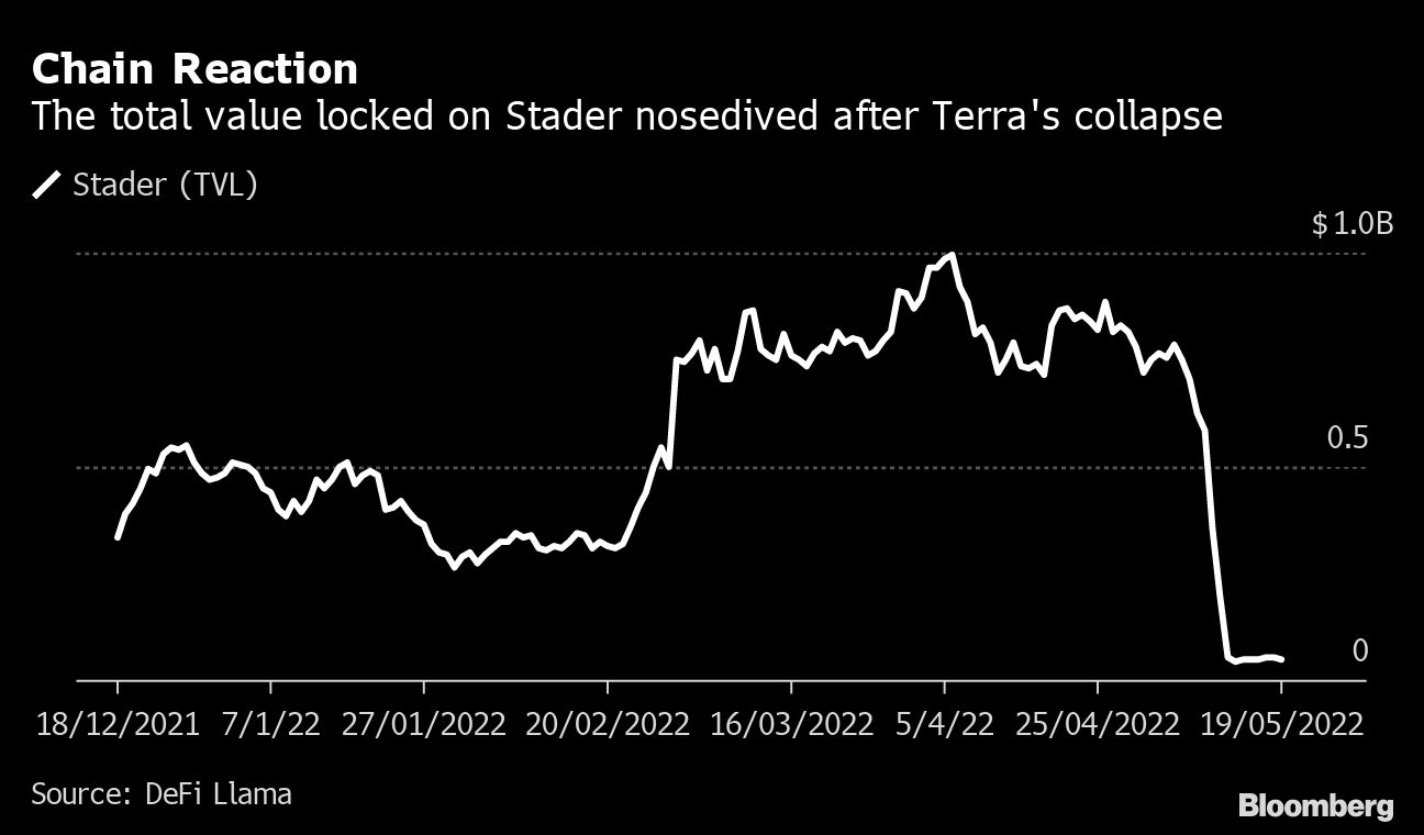 When TerraUSD (UST) collapsed from its intended 1-to-1 peg to the dollar this month and dragged Luna down with it, the impact on Stader's business was swift. The total value locked on its protocol has dropped to $50 million from about $750 million just before the event, data from industry tracker DeFi Llama show.