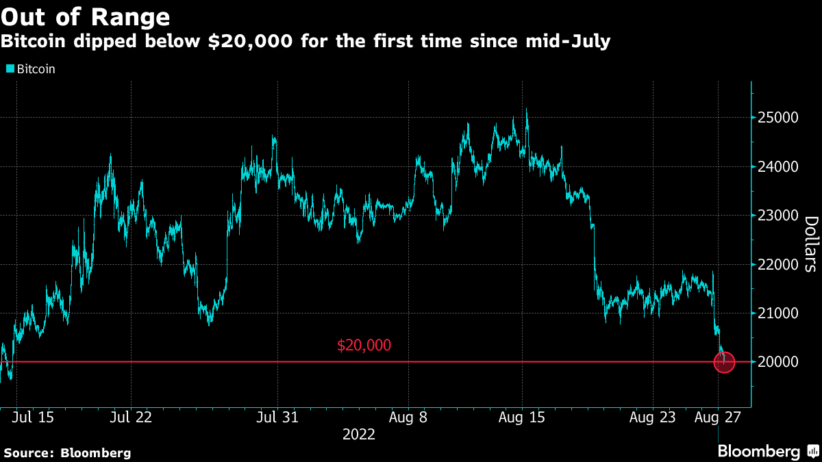 The largest cryptocurrency by market shed as much as 4% to $19,833 on Saturday as of 11:43 a.m. in New York, dipping below $20,000 for the first time since July 14 and extending its rout this year to 57%. It has traded in a range between that level and about $22,000 for the past week.