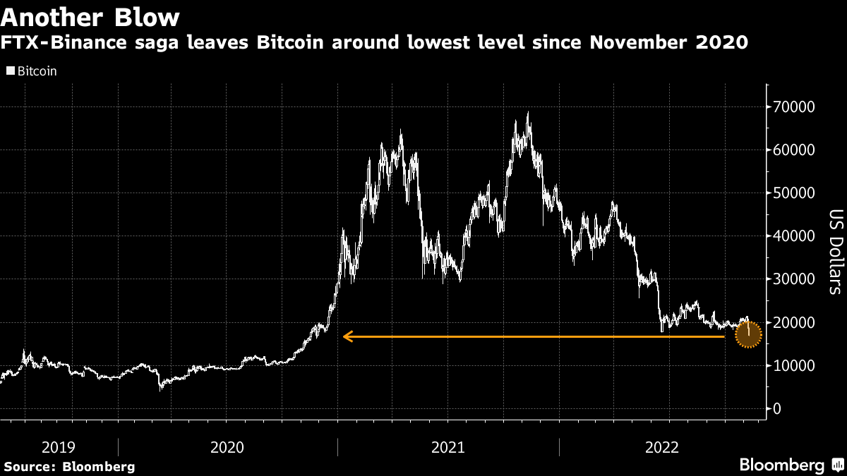 (Bloomberg) -- The week's rout in cryptocurrencies deepened, with Bitcoin tumbling to the lowest levels in two years, as Binance walked away from its planned takeover of FTX.com.