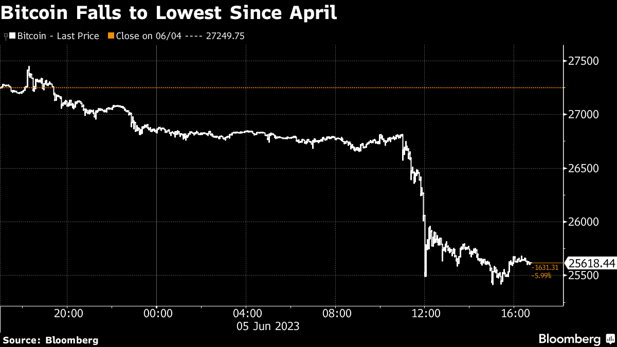 Bitcoin fell as much as 6.7% to $25,415, the least since April, as of 4:51 p.m. in New York. Binance Coin, the native token of the ecosystem of the world's biggest digital asset exchange, slumped as much as 13%. Bitcoin accounts for almost 50% of the value of the $1.2 trillion crypto market, according to data from CoinMarketCap. Binance Coin is the fourth-largest token, with a market value of around $43 billion. Binance handles around 50% of all crypto trading volume.
