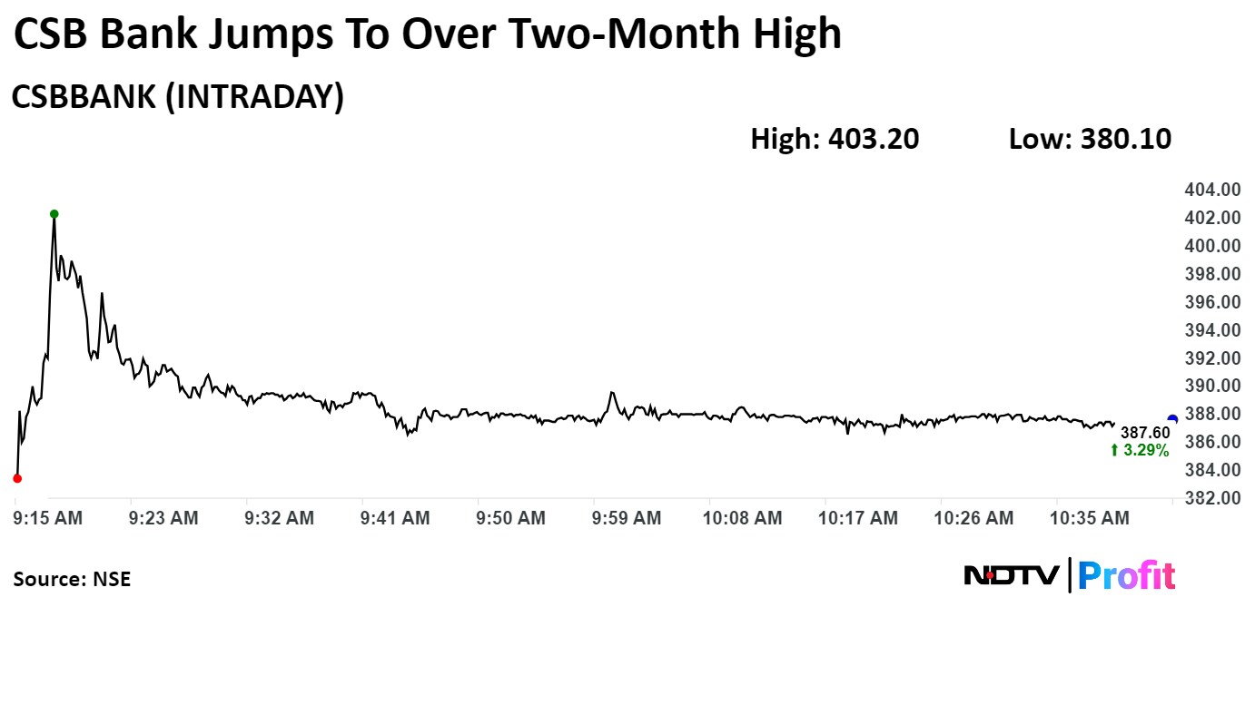 On the NSE, CSB Bank's stock rose as much as 7.45% during the day to Rs 403.20 apiece, the highest since April 26. It was trading 3.52% higher at Rs 387.40 per share, compared to a 0.01% advance in the benchmark Nifty at 10:52 a.m.