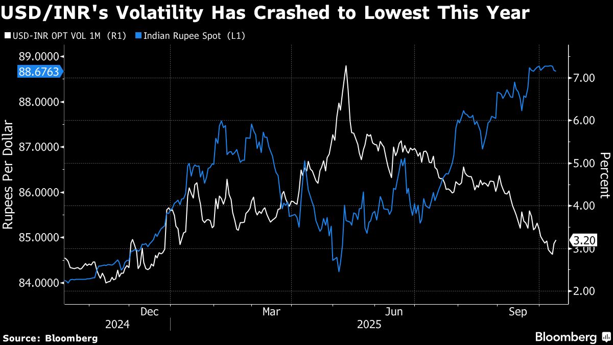 The one-month volatility in the dollar-rupee pair has crashed to the year's lowest level this month. The currency has been stuck in a narrow range, struggling to break past the 89-per-dollar mark after hitting fresh lows.