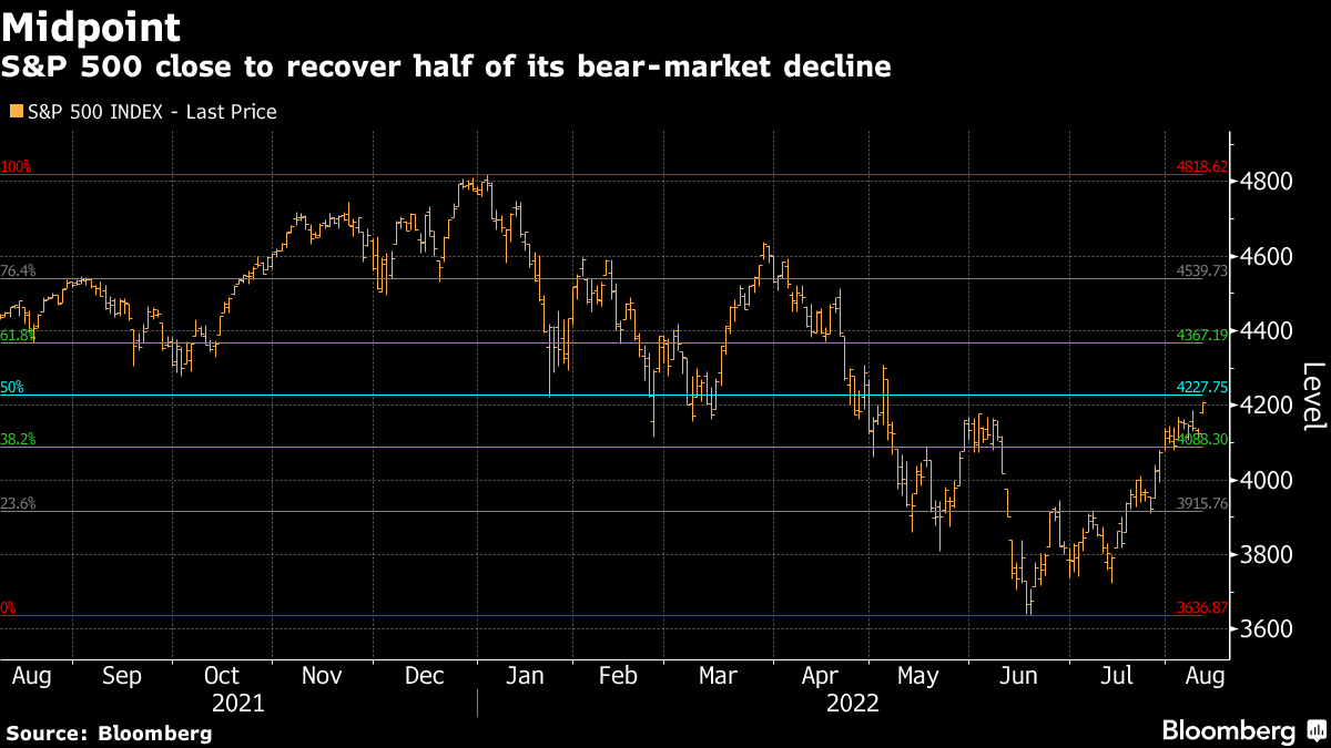 All the bearishness was met with a painful reckoning as the equity rally showed no signs of abating, or at least not yet. Up 15% from its June trough, the S&P 500 has broken resistance after resistance, with the index sitting around 20 points from recouping half of its bear market losses, a milestone that some chartists say will herald a full recovery.