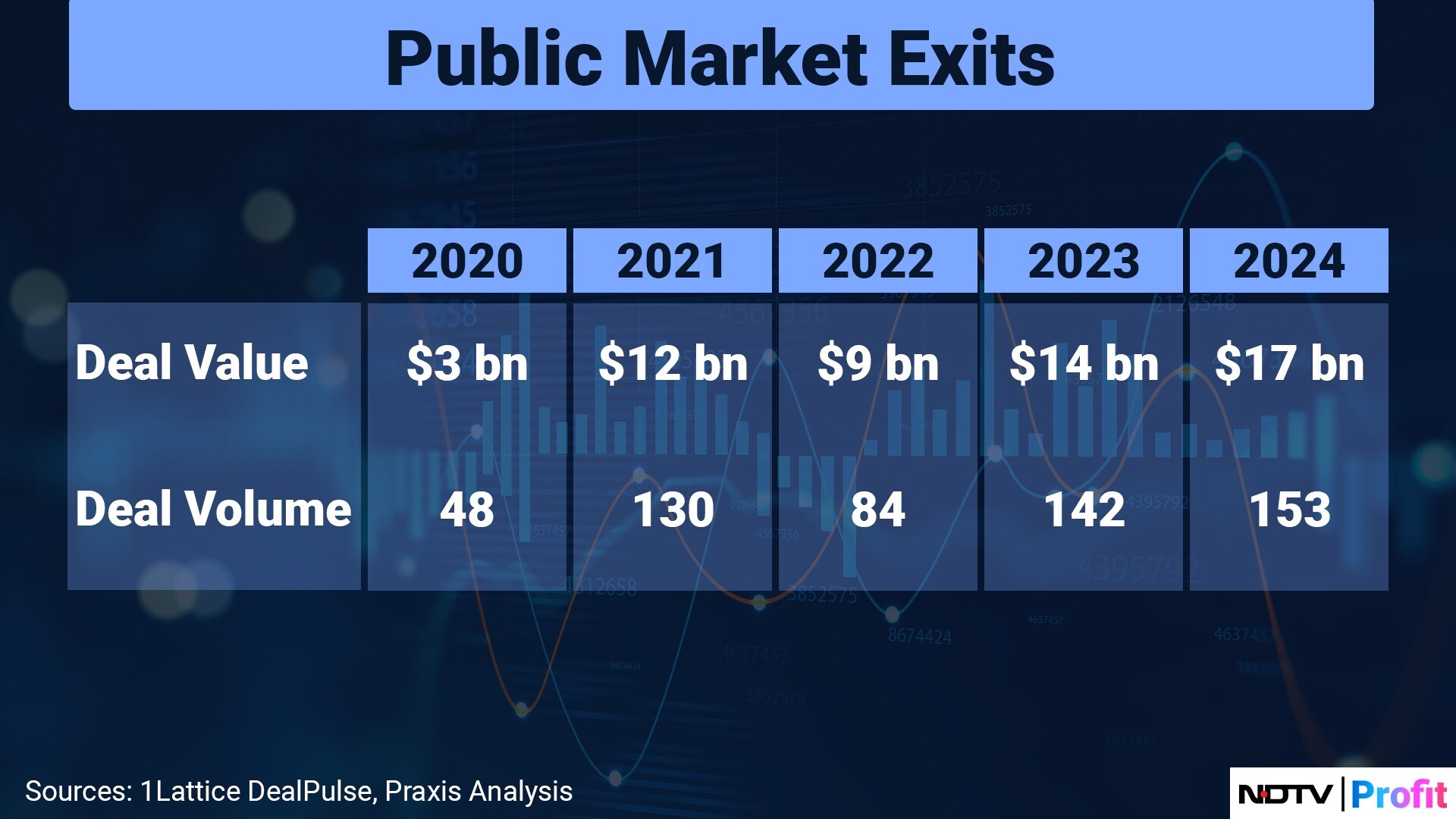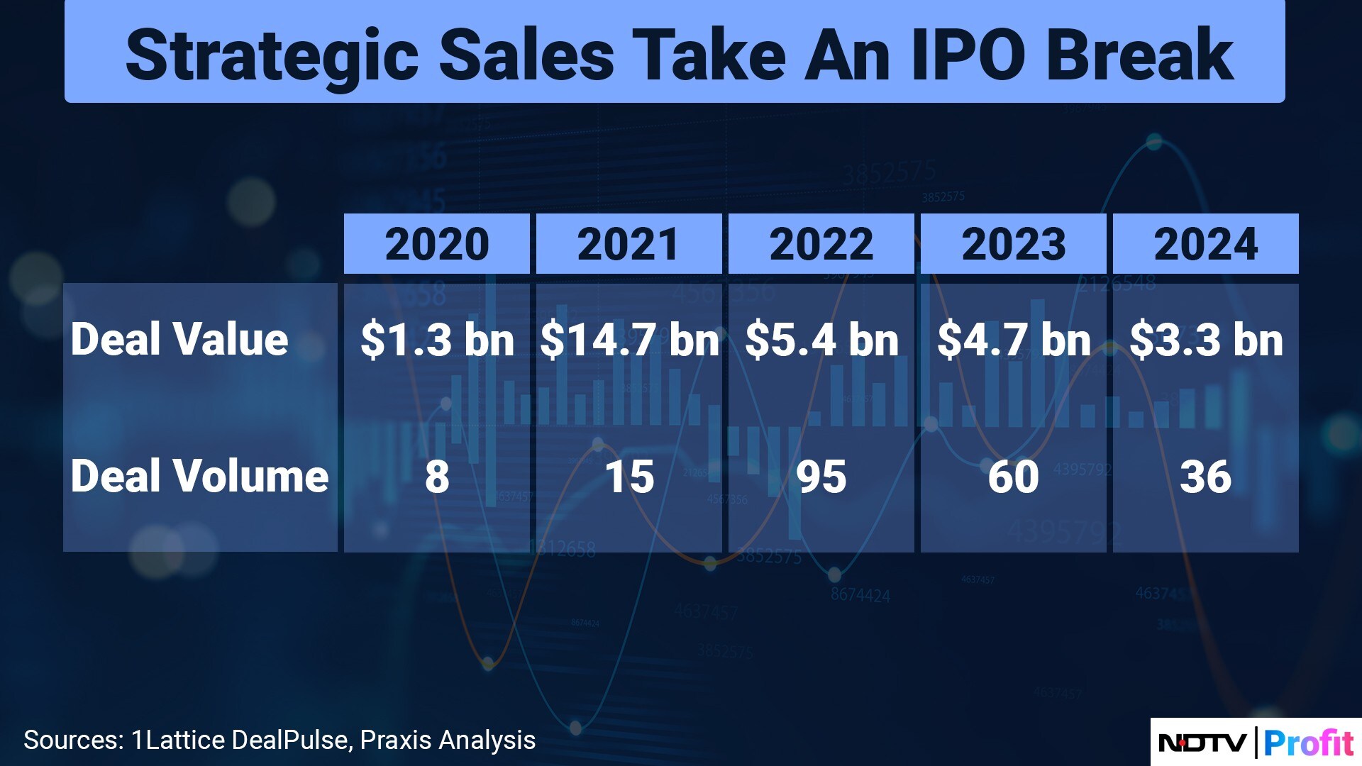 In 2024, the number of strategic sales of PE/VC firms to companies or other PE funds slipped to its lowest in three years — falling from $4.7 billion to $3.3 billion in 2023, registering a 29% drop, as per India Investments Pulse report by Praxis Global Alliance shared with NDTVProfit.com.