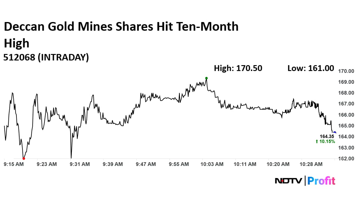 The shares of Deccan Gold Mines rose as much as 14.28% to Rs 170.50 apiece, the highest level since Aug. 6, 2024. It pared gains to trade 11.70% higher at Rs 166.75 apiece, as of 10:17 a.m. This compares to a 0.38% advance in the Sensex index.