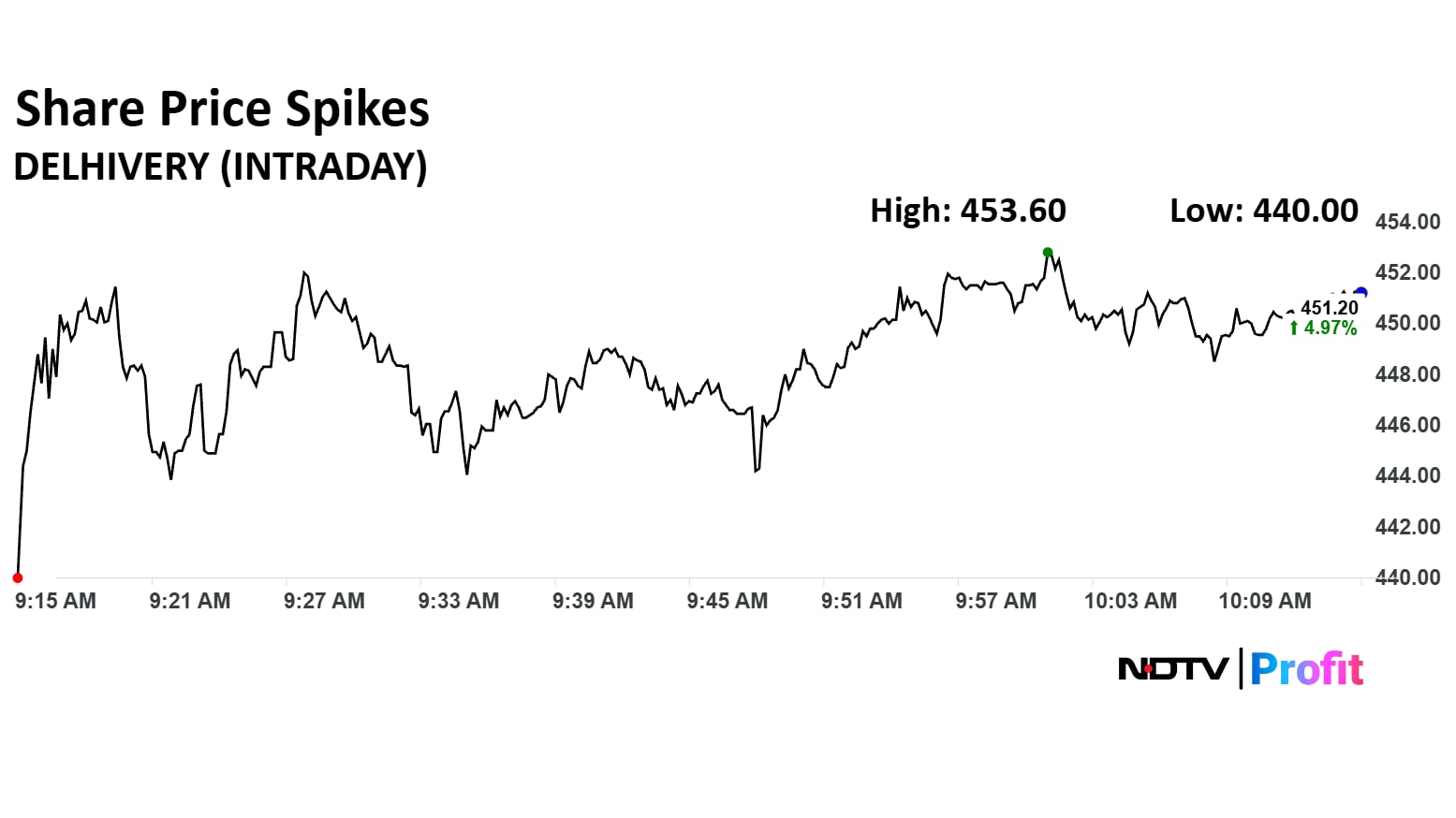 Delhivery share price spiked 5.53% on Monday hitting a 52-week high after the company posted a 70% spike in its net profit in first quarter results of financial year 2026. The company's revenue came at Rs 2,294 crore, up 5.6% on an annual basis.