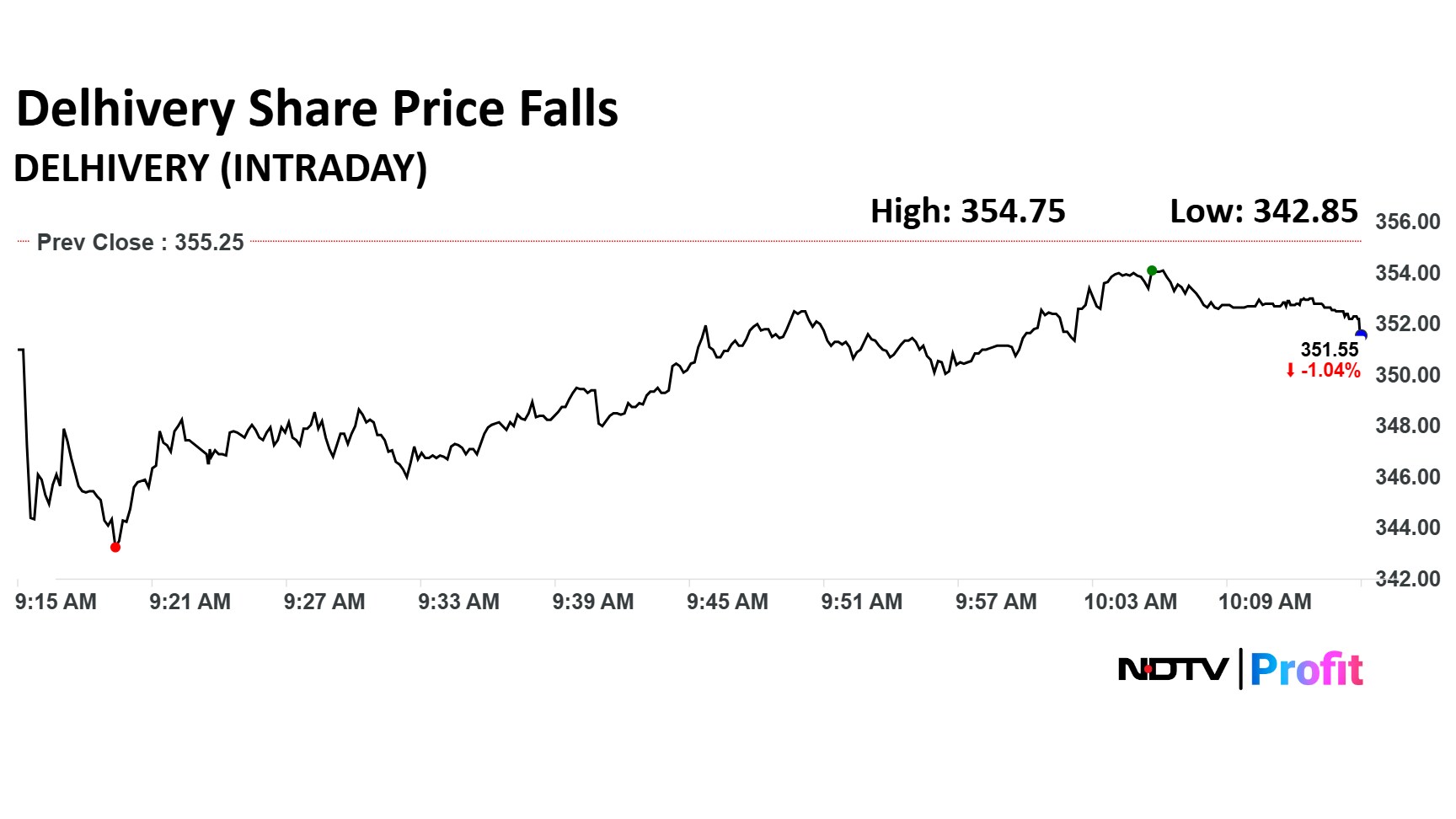 The scrip fell as much as 3.49% to Rs 342.85 apiece, the lowest level since May 21, 2025. It pared losses to trade 0.72% lower at Rs 352.70 apiece, as of 10:10 a.m. This compares to a 0.38% advance in the NSE Nifty 50.