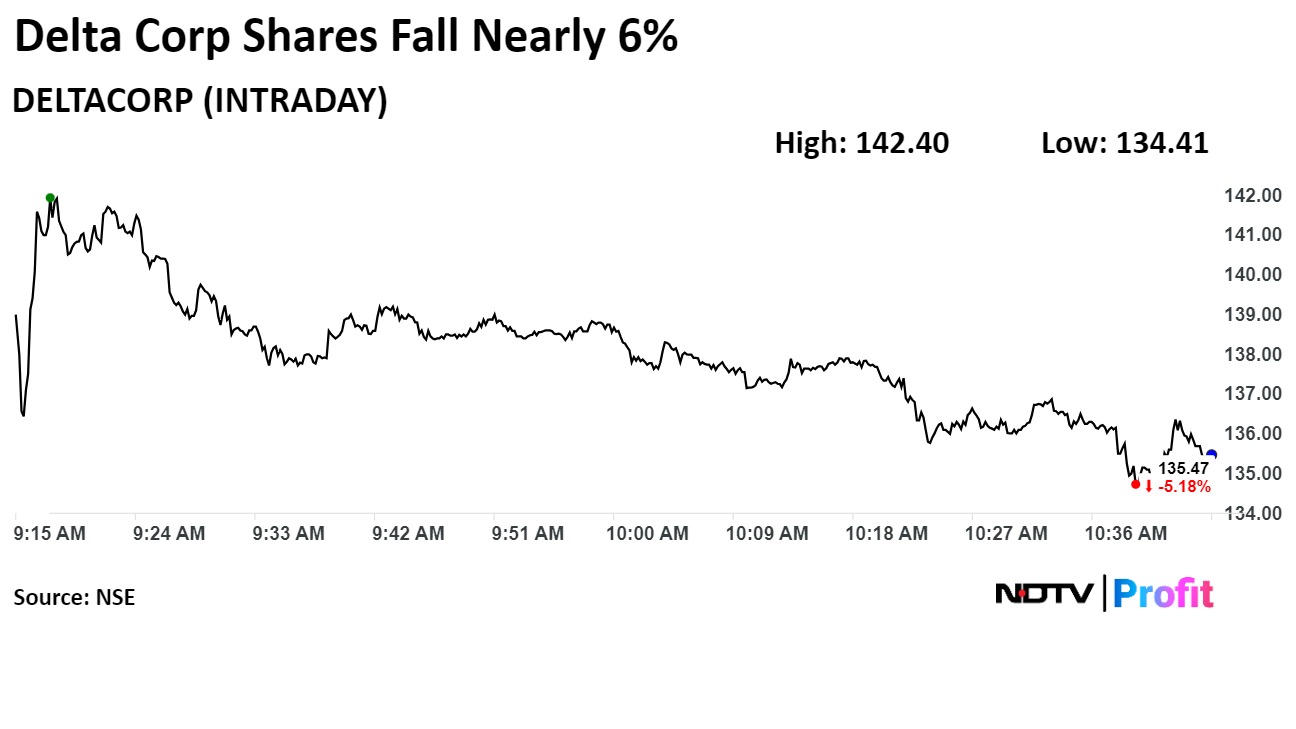 Delta Corp's stock fell as much as 5.92% during the day to Rs 134.41 apiece on the NSE. It was trading 4.74% lower at Rs 136.1 apiece, compared to a 1.18% decline in the benchmark Nifty as of 10:41 a.m.