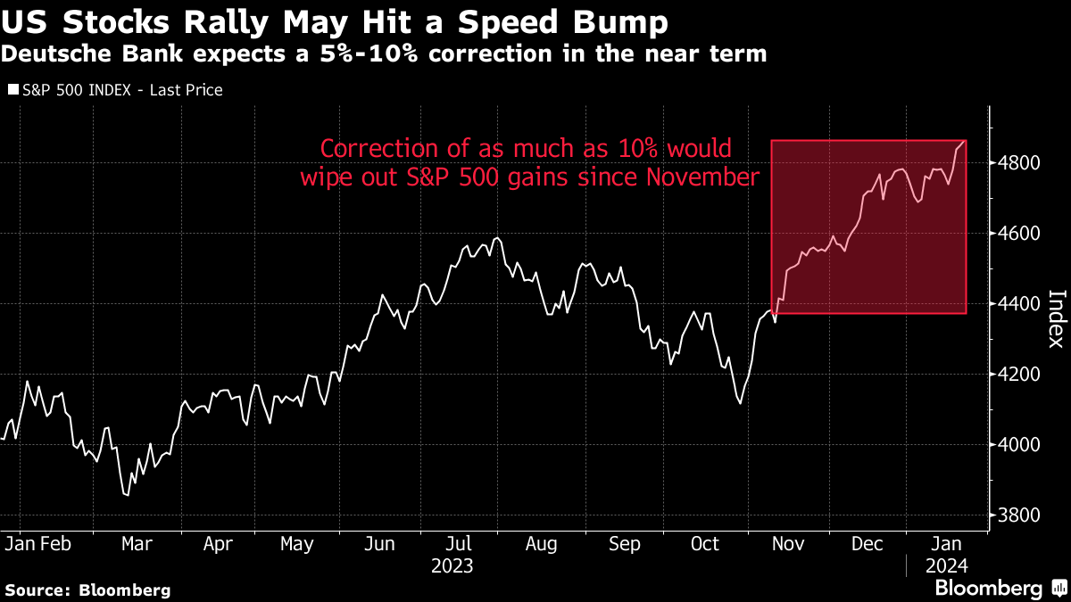 (Bloomberg) -- The US stock market may suffer a correction in coming months as the economy slows, according to Deutsche Bank AG.