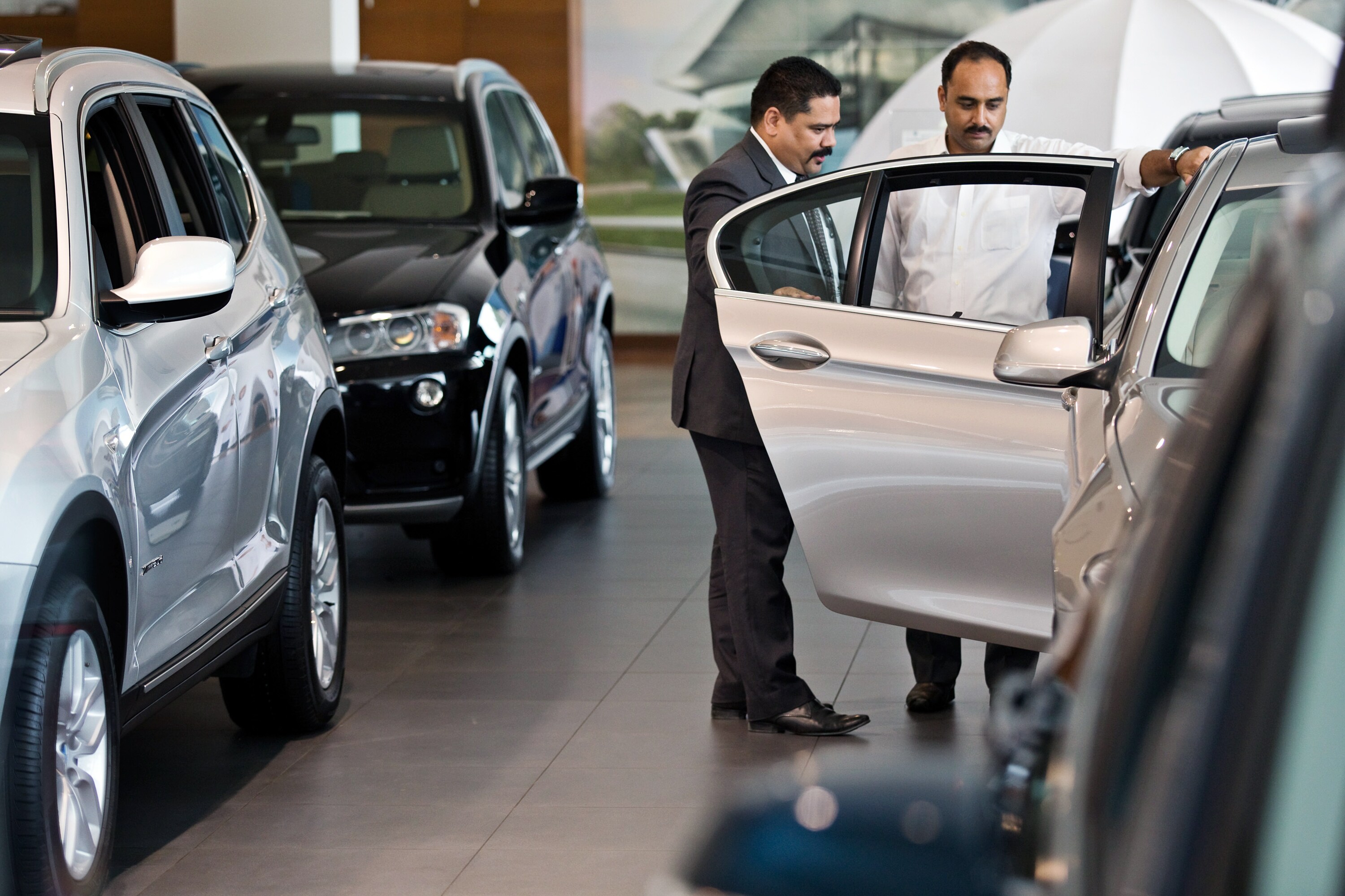 A sales assistant shows a car to a customer. (Image: Photographer: Graham Crouch/Bloomberg)